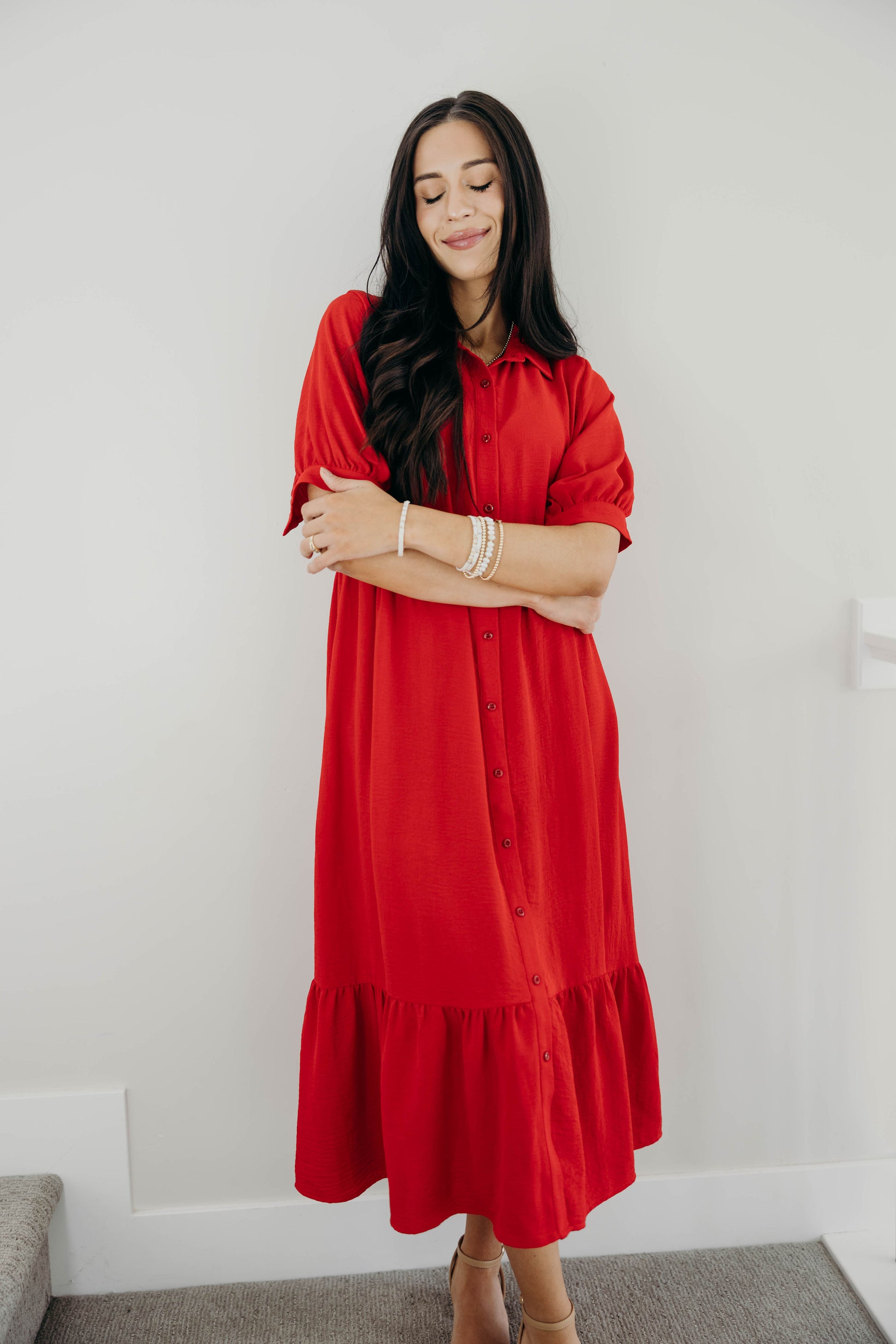 Maxi length dress with ruffle hem, functioning buttons, collar, and short puff sleeves.
