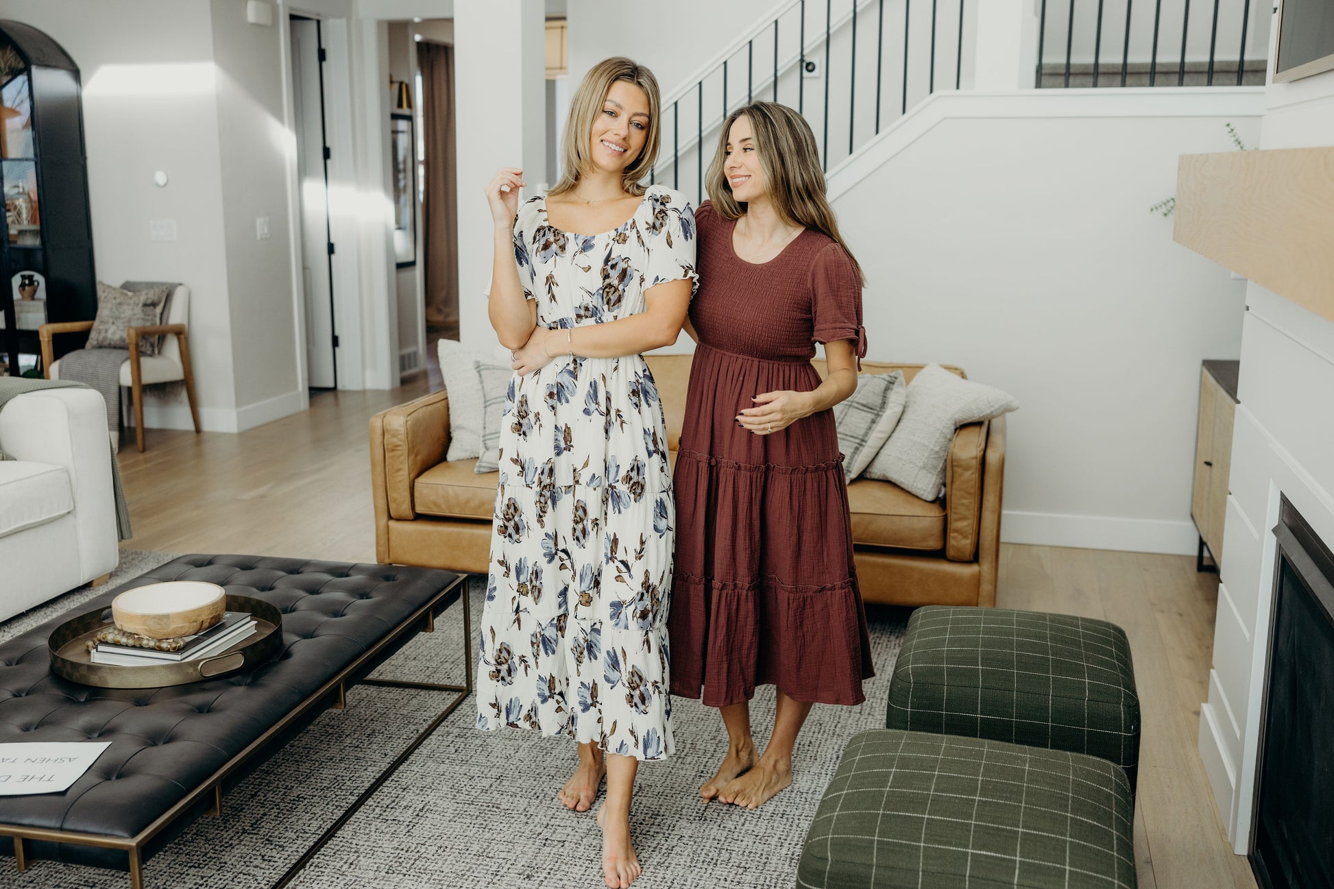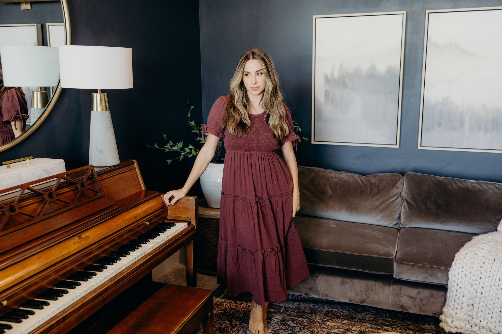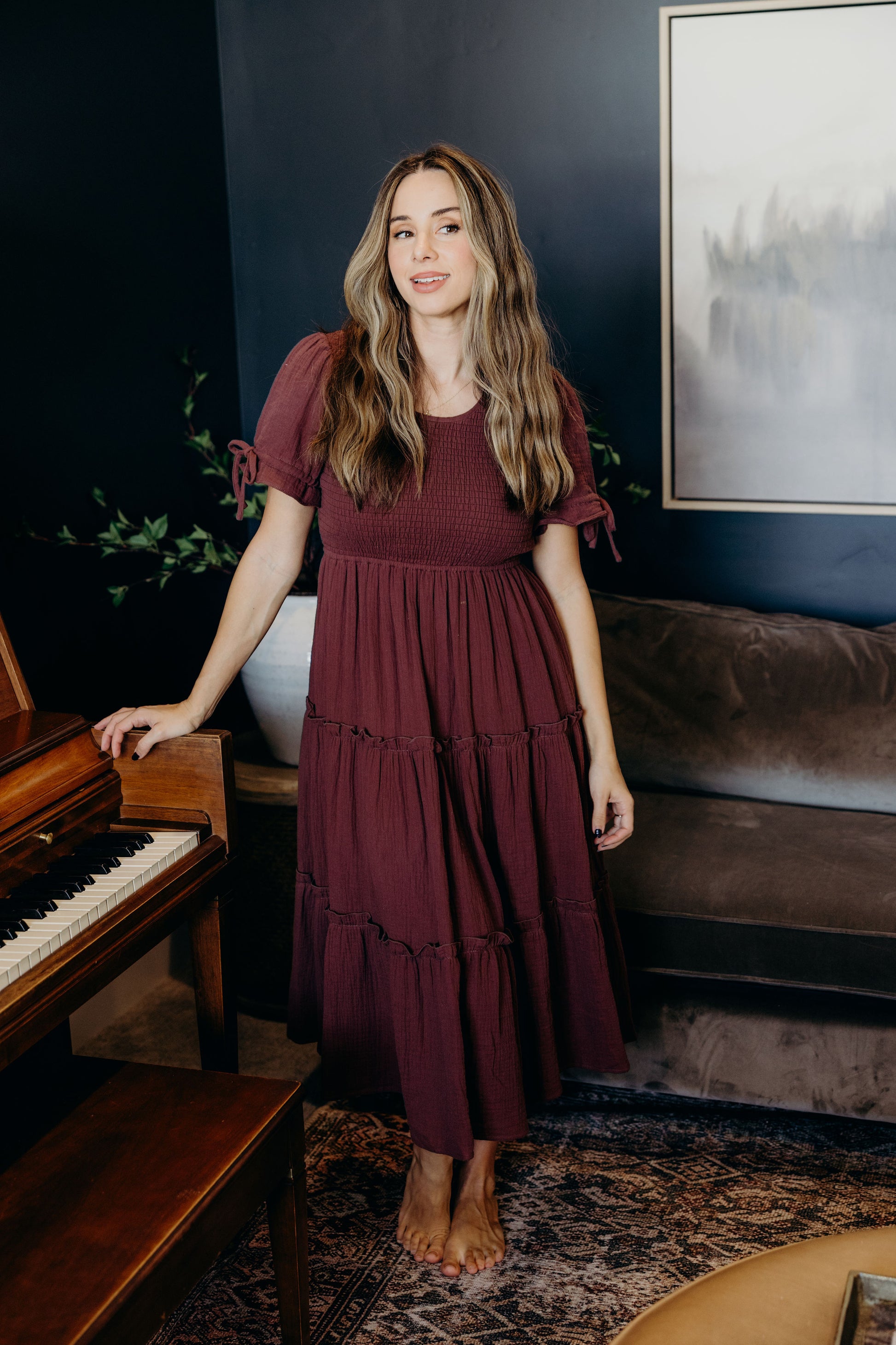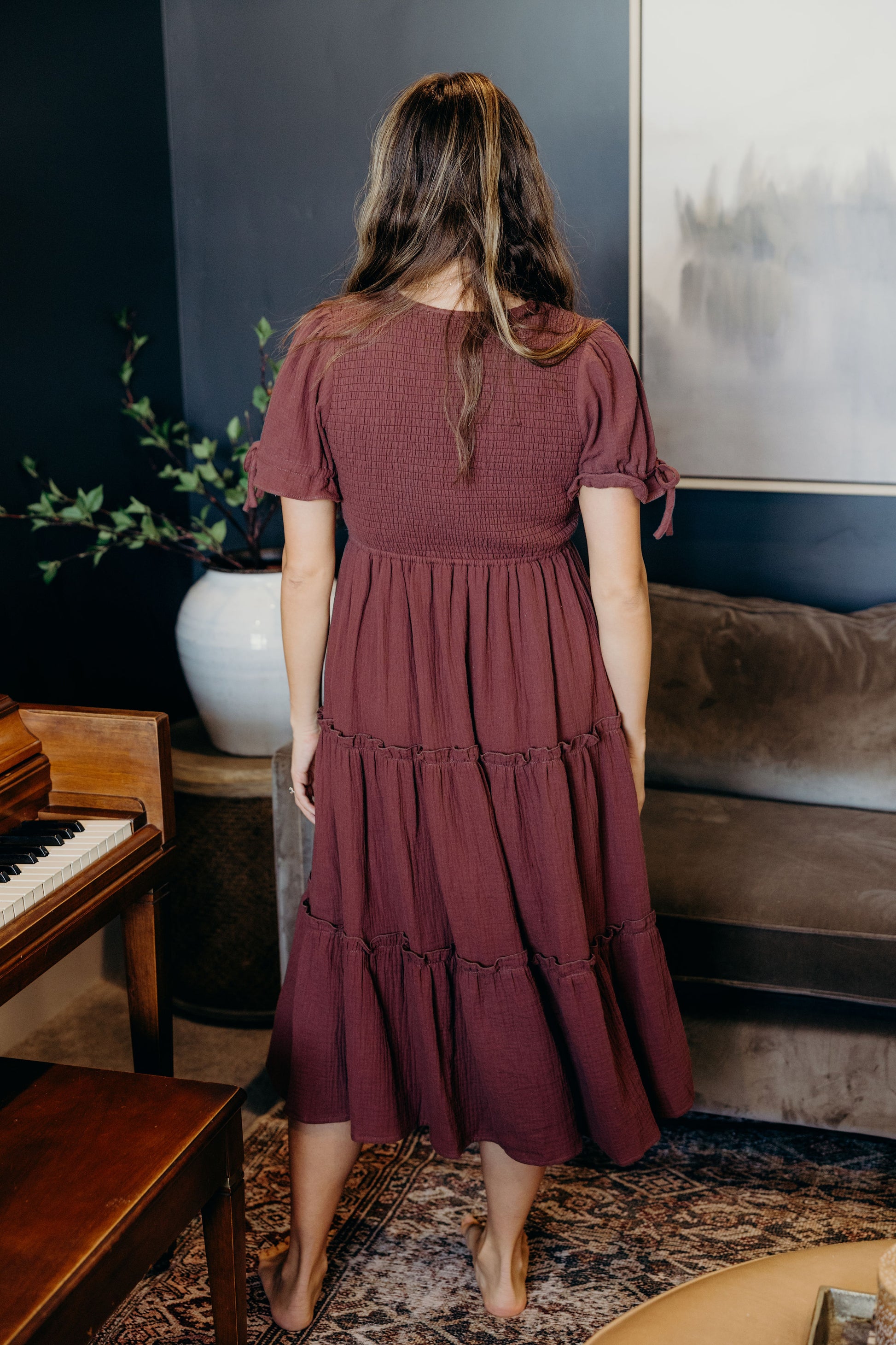 Midi length dress with textured fabric, smocked bodice, round neckline, short sleeves with tie detail, and tiered skirt.