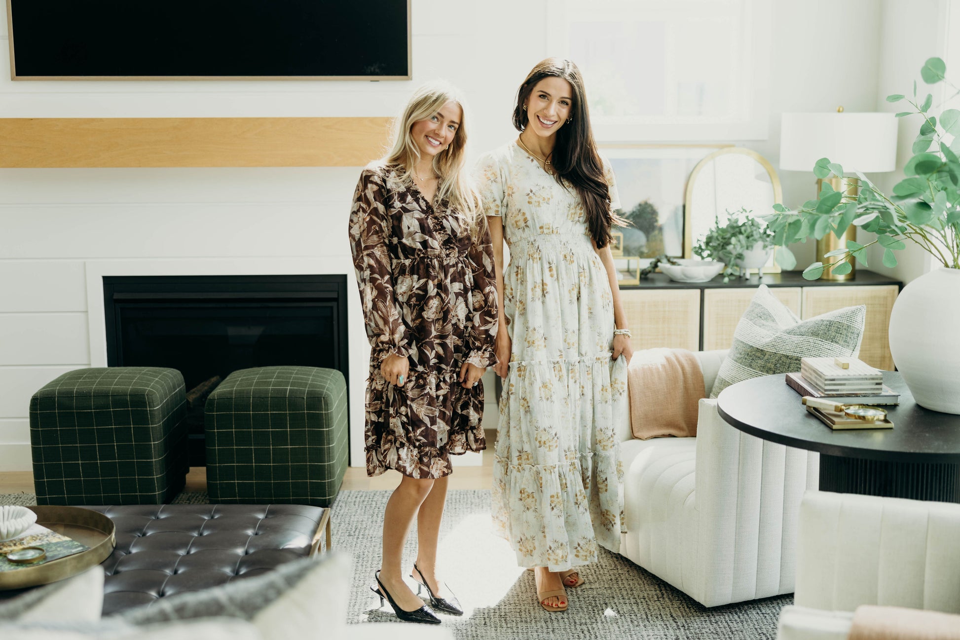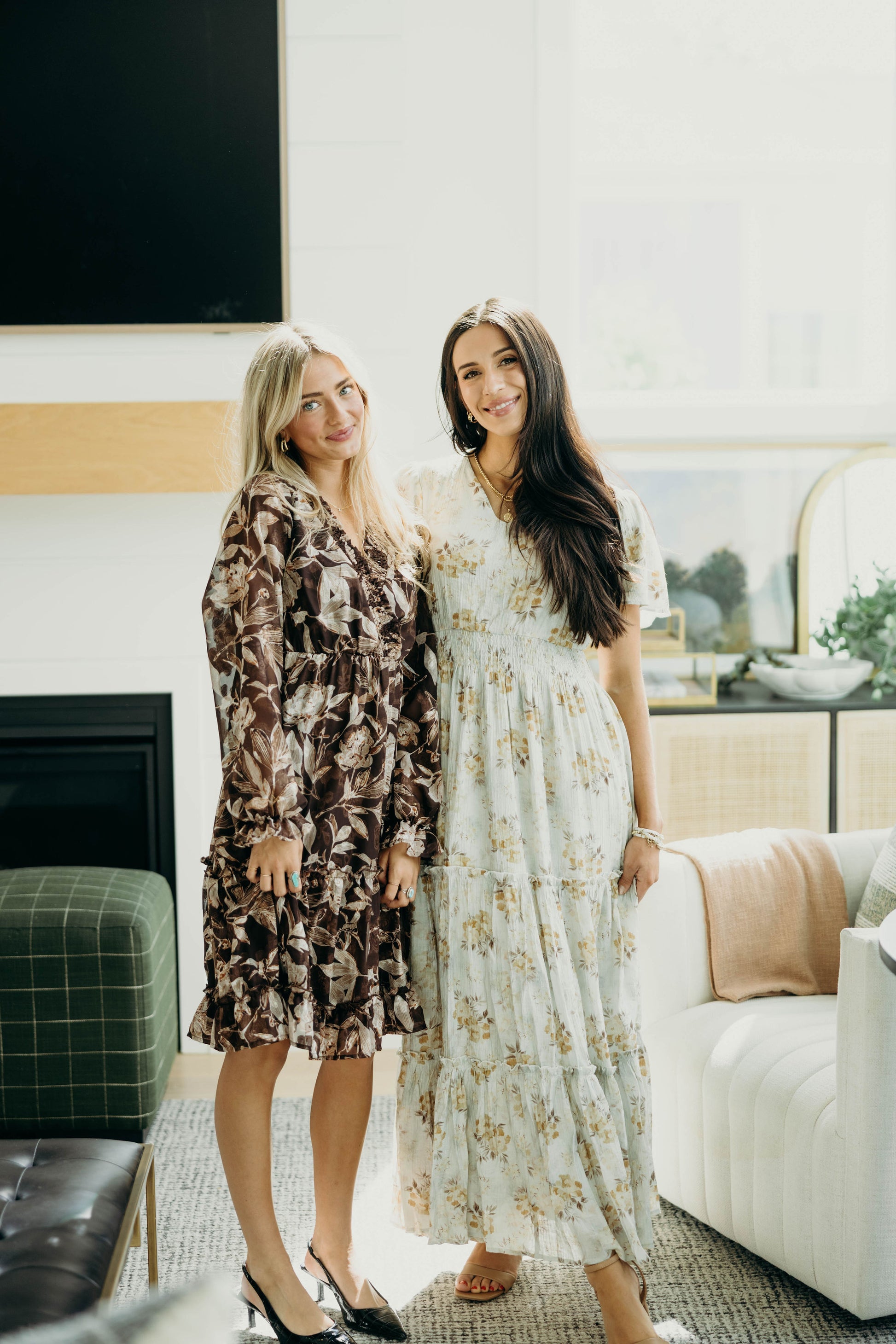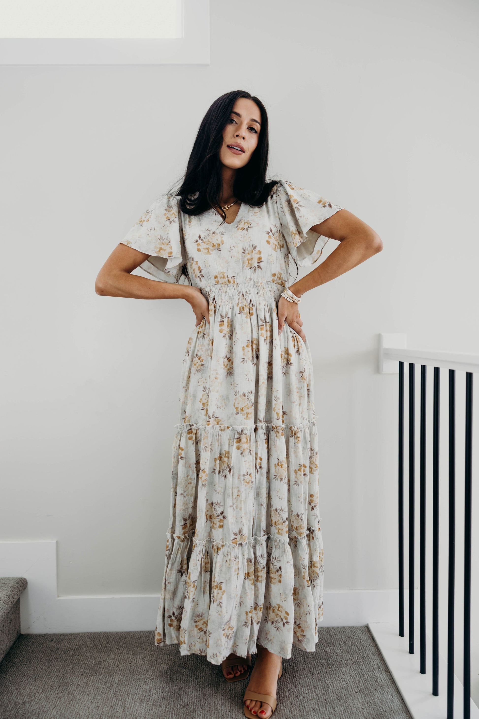 Full-length dress with a tiered skirt, elastic waist, v-neckline and flutter sleeves.