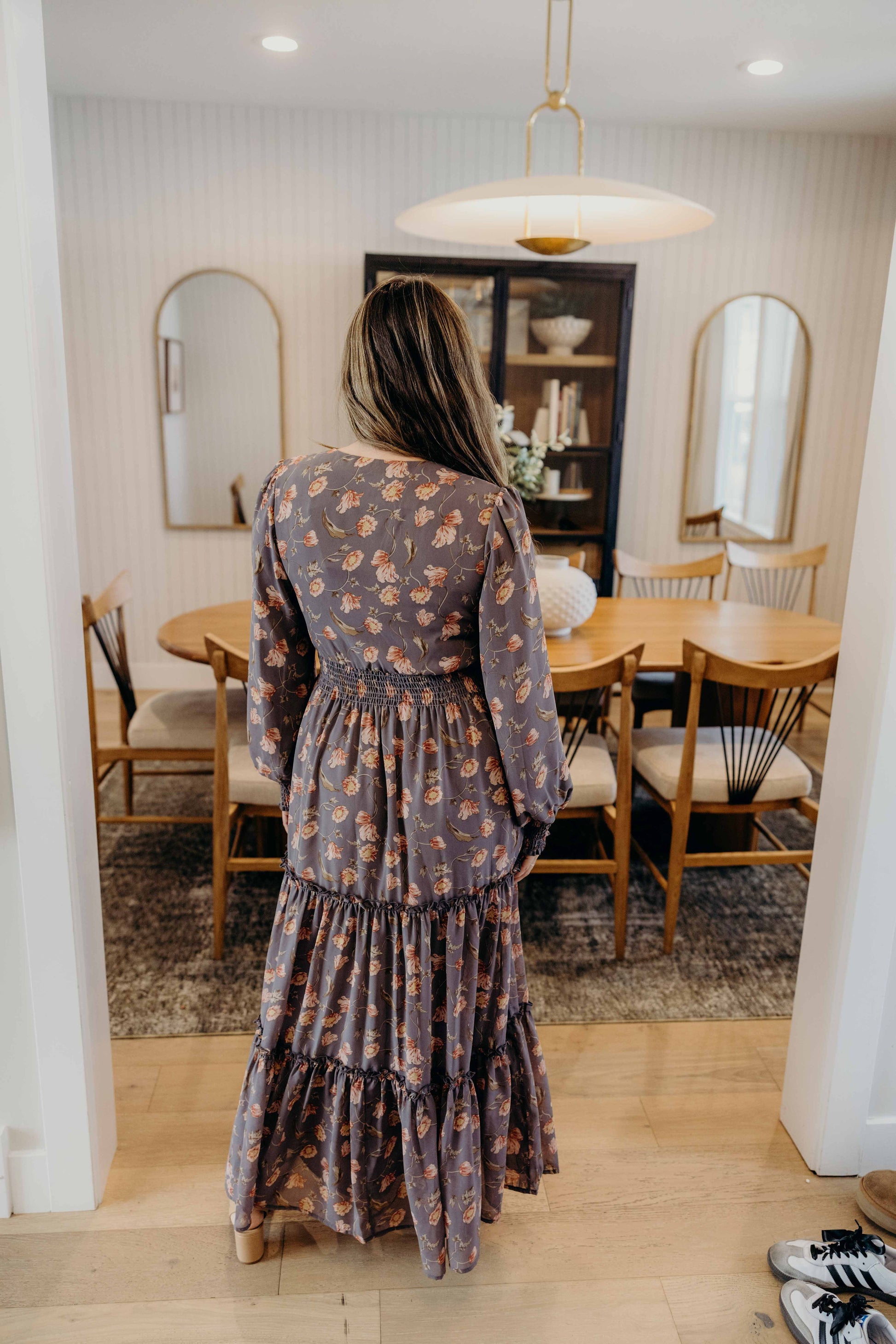 Maxi length dress with long sleeves, tiered skirt, smocked waist and cuffs, v neckline, and pockets.