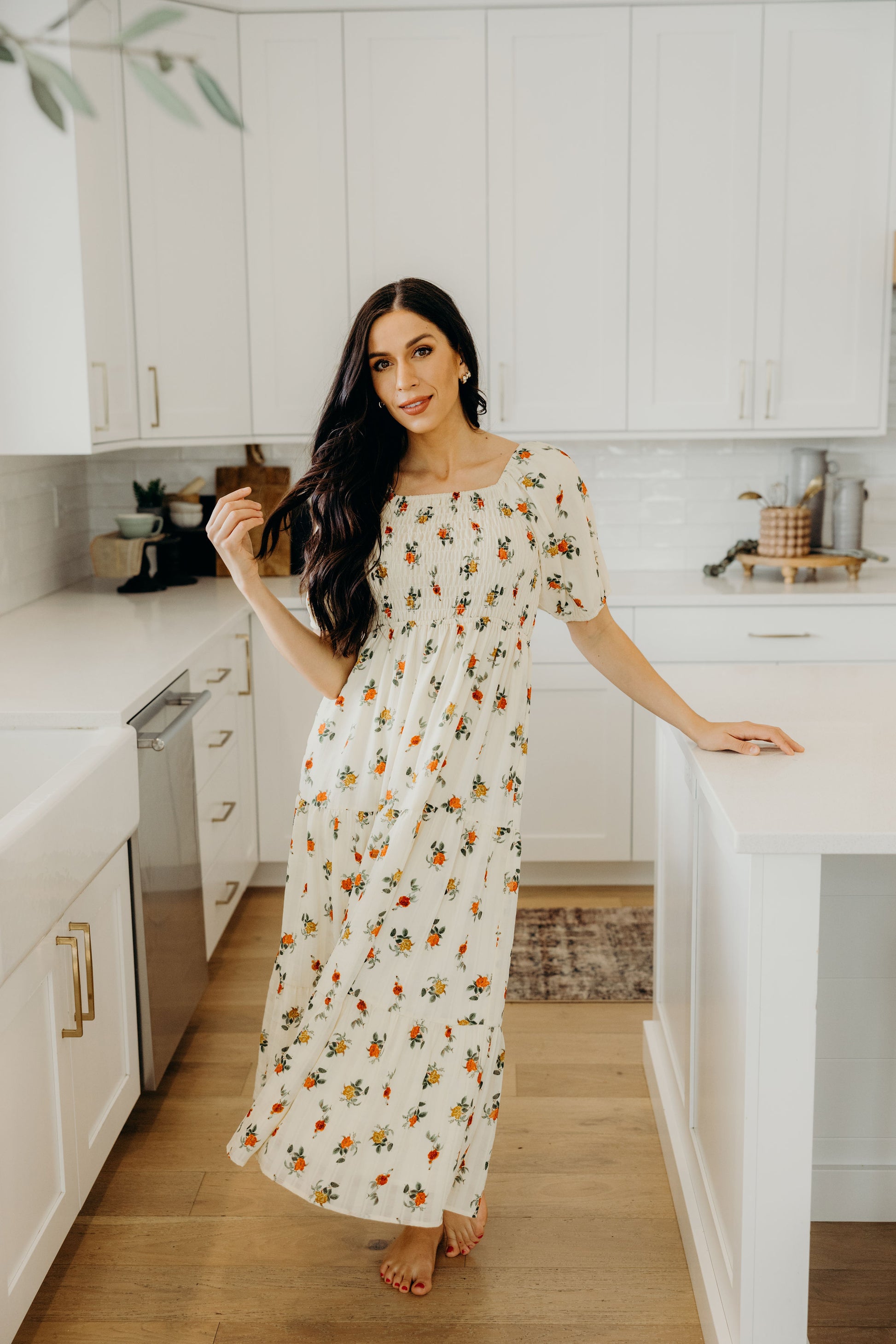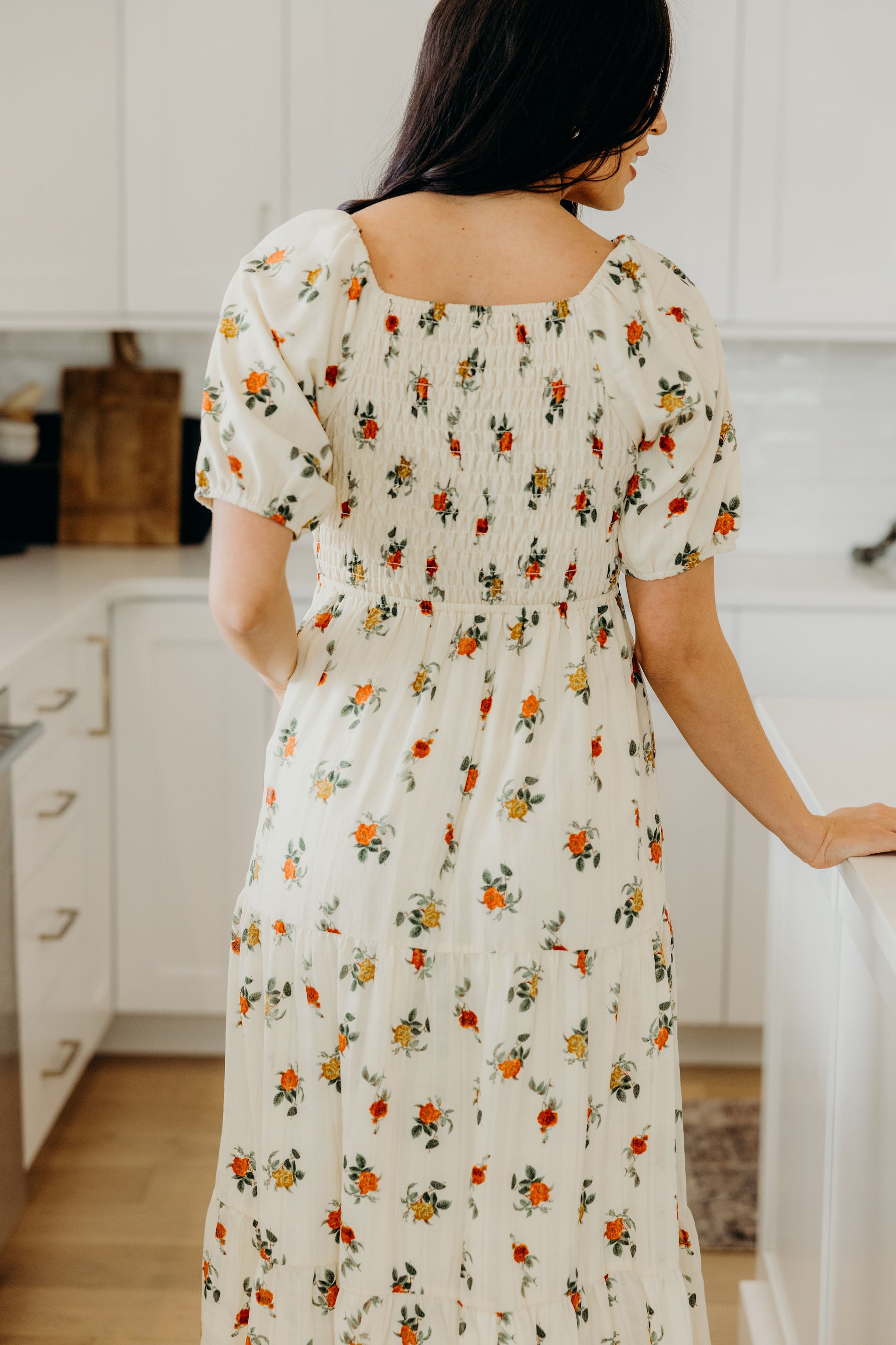 Midi length dress with tiered skirt, smocked bodice, square neckline, and puff sleeves.