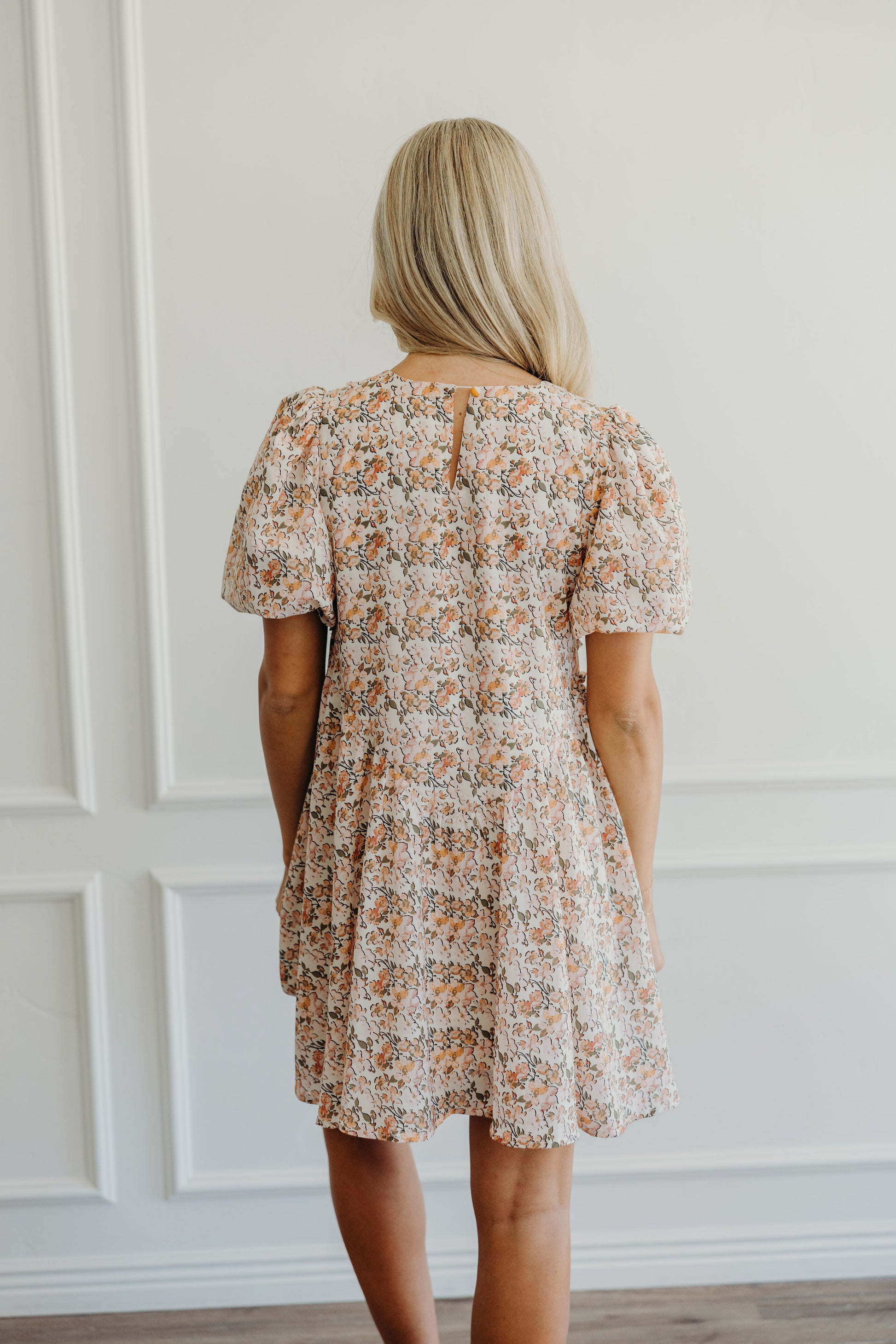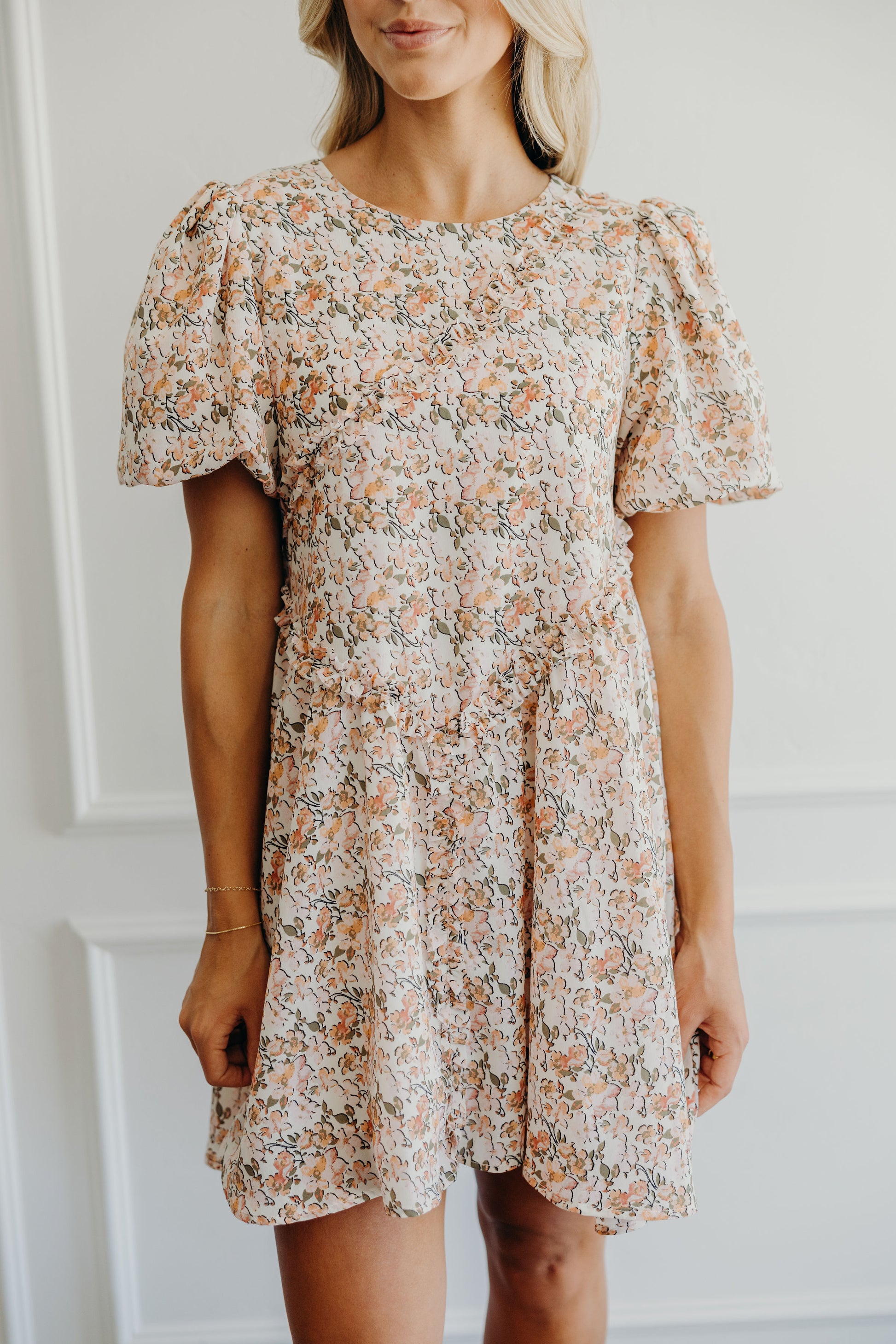 Short fit and flare dress with high neckline and bubble sleeves with asymmetrical ruffle detail.