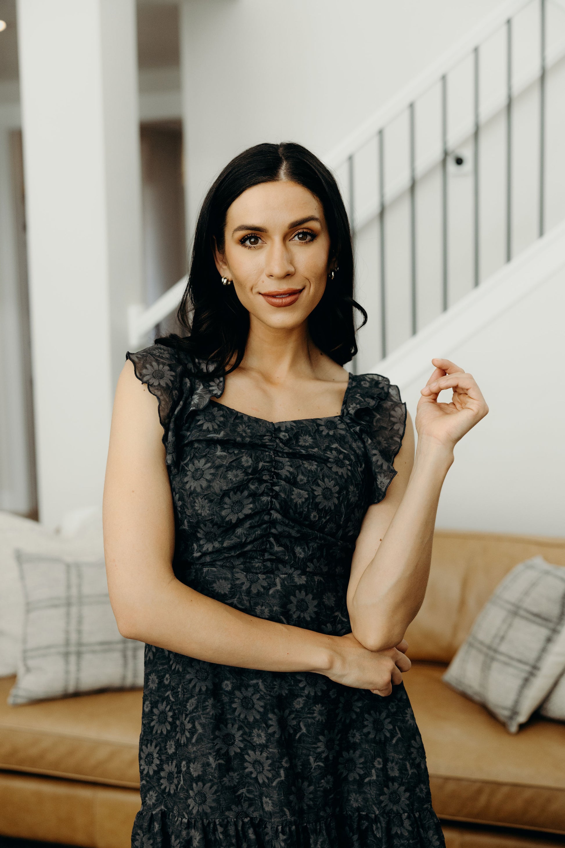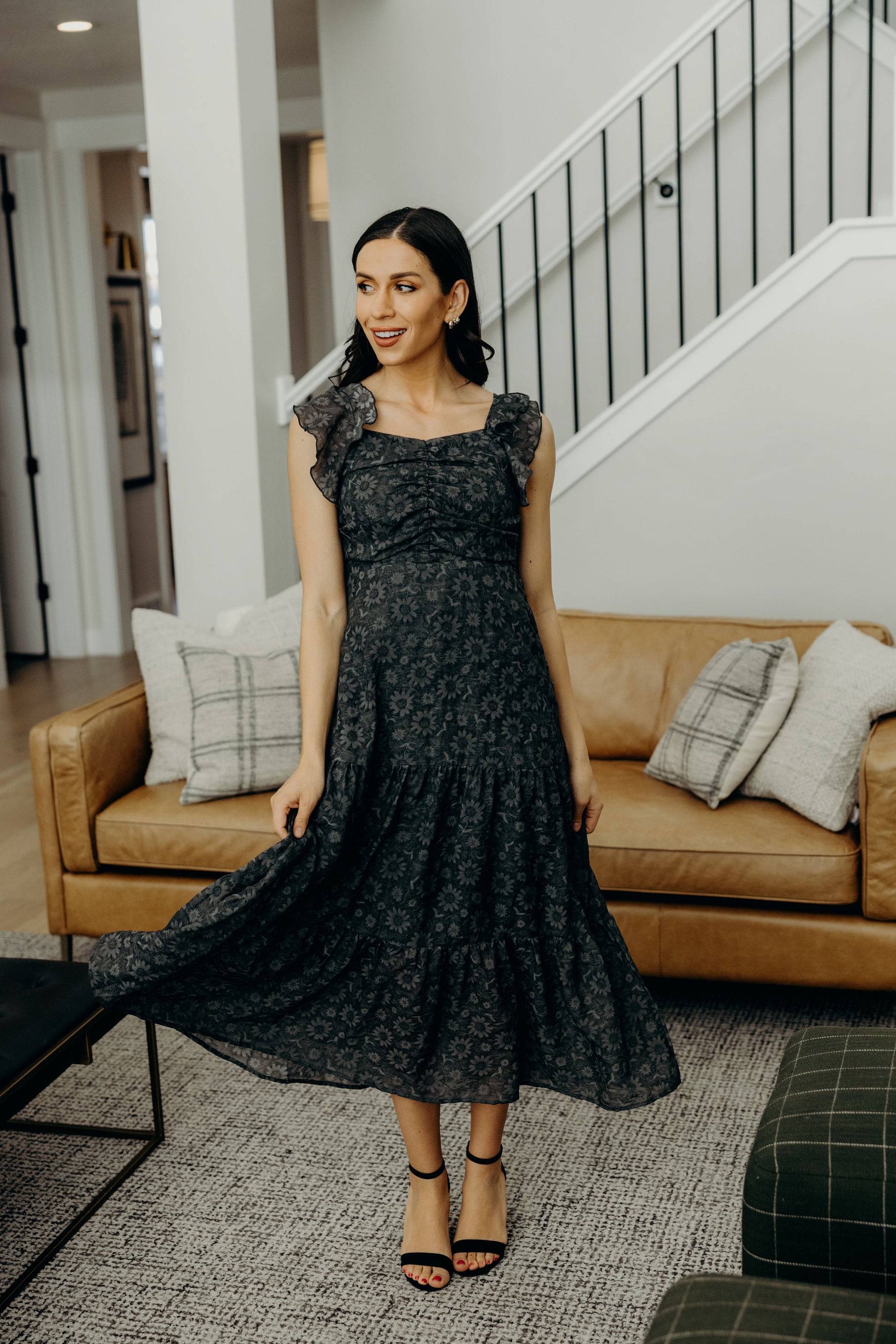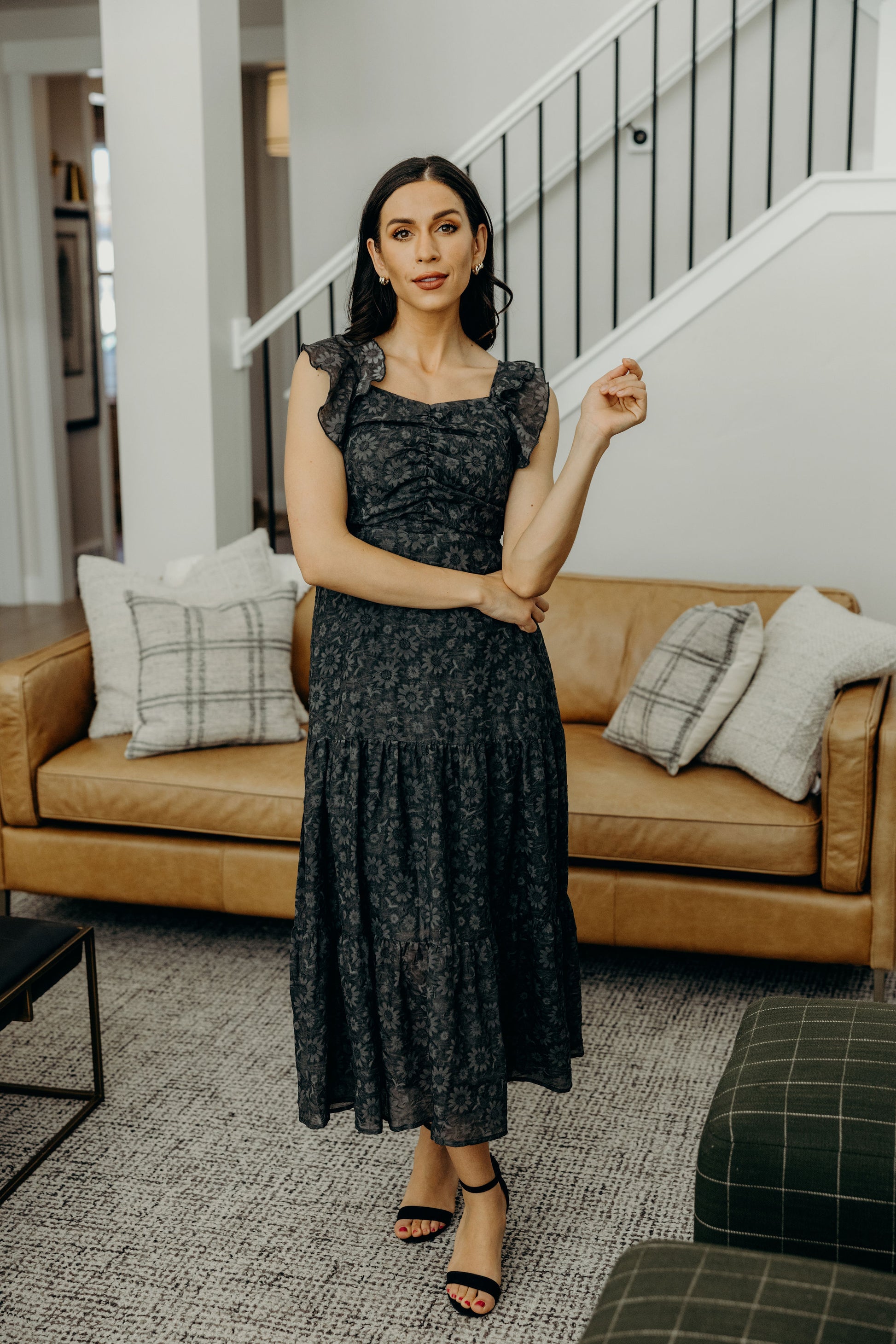 Tea-length dress with a tiered skirt, gathered bodice with sweetheart neckline, and flutter sleeves.