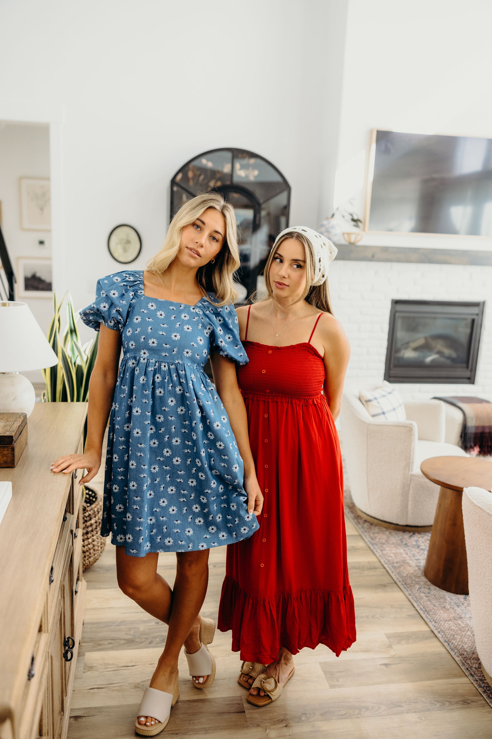 Tea length dress with ruffle hem, button detail, smocked bodice with ruffle detail on waist and neckline.