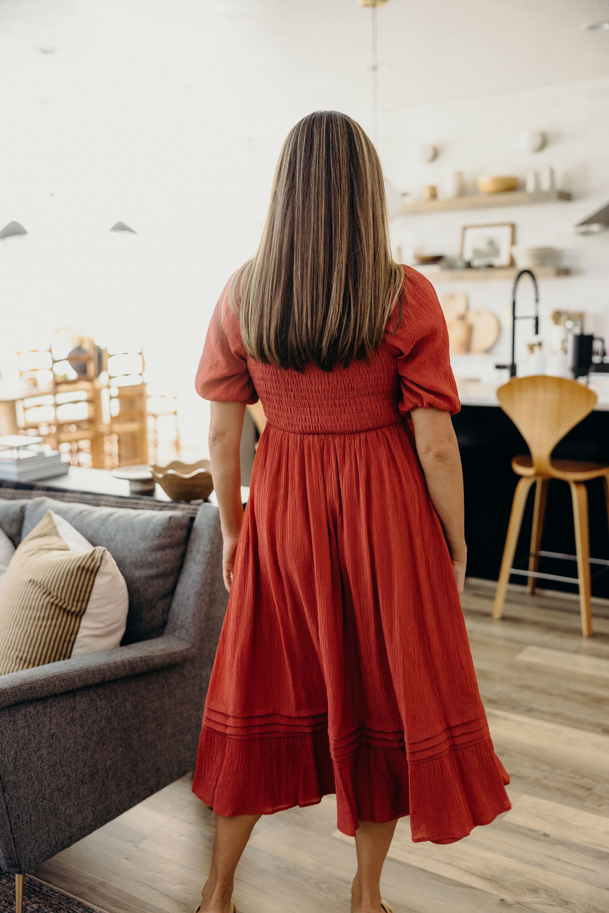 Midi length dress, with empire waist, sweetheart neckline and puff sleeve with ruffle detail on hem.