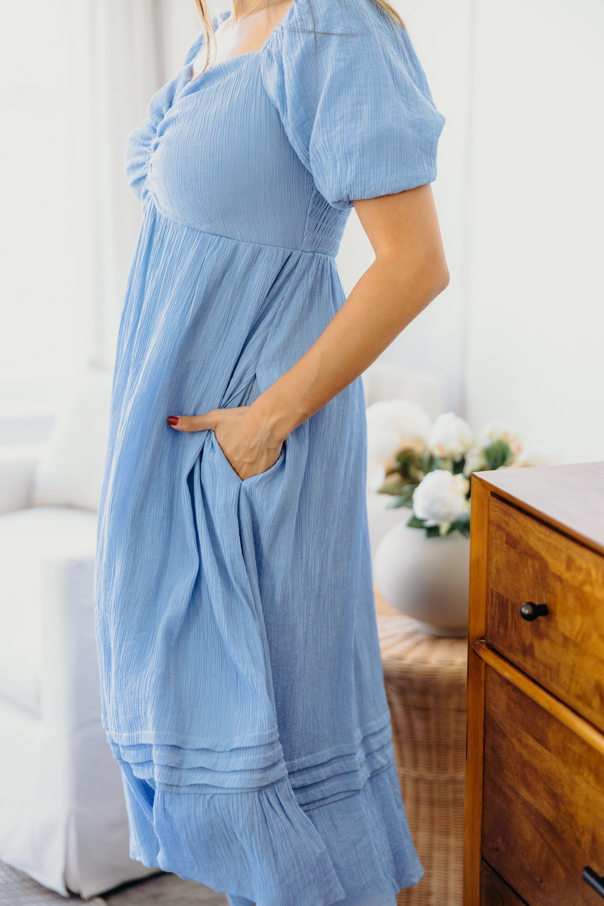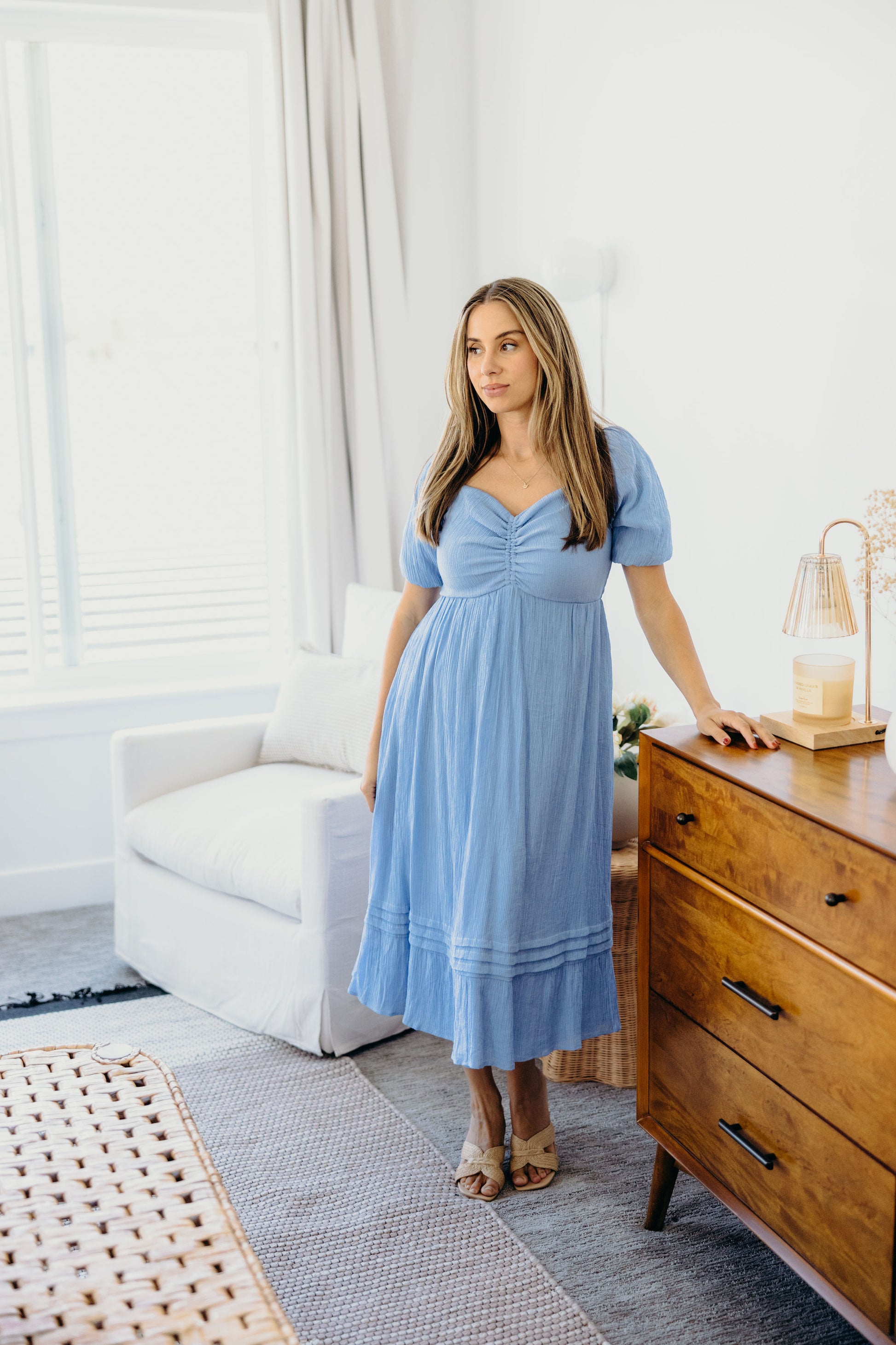 Midi length dress, with empire waist, sweetheart neckline and puff sleeve with ruffle detail on hem.