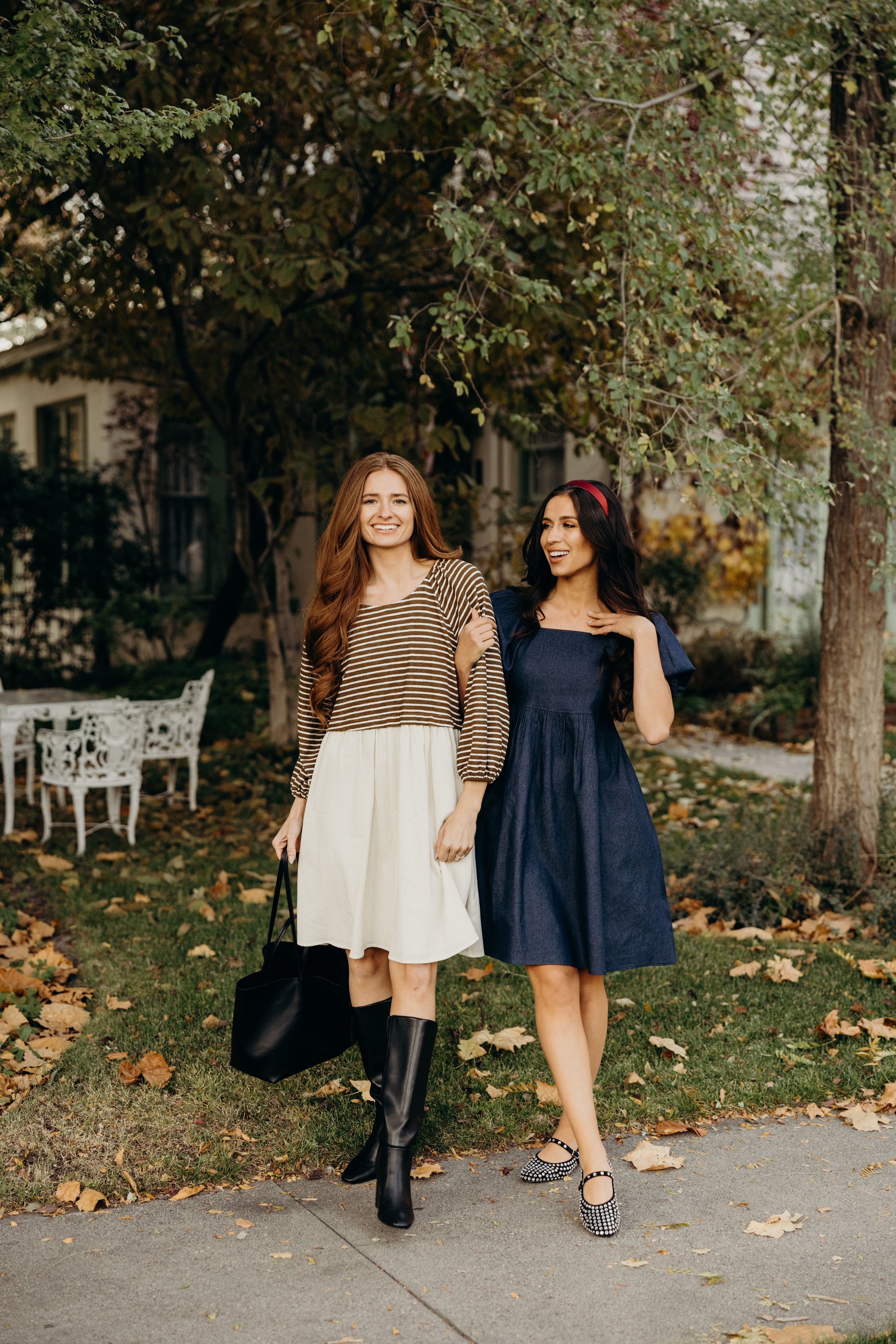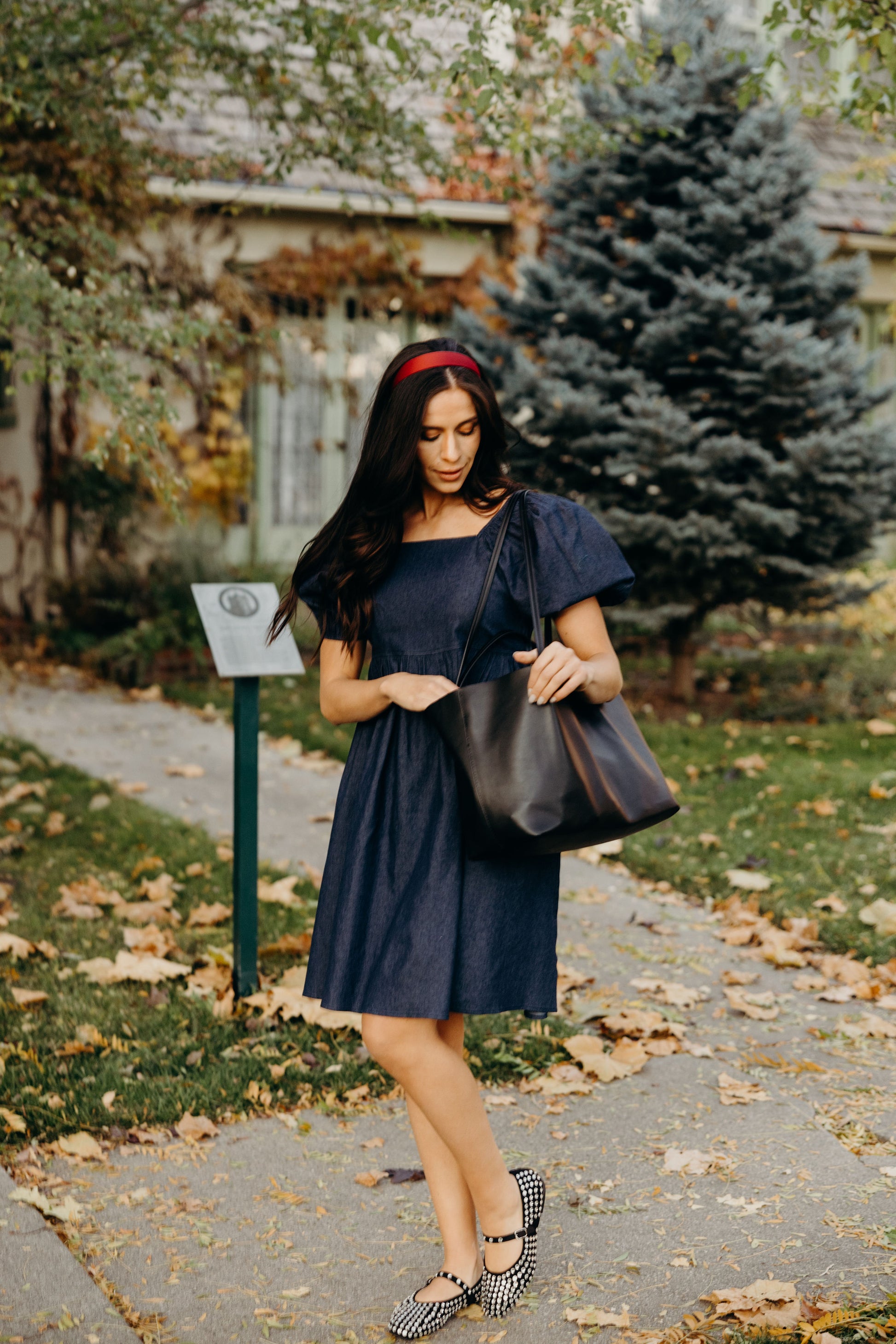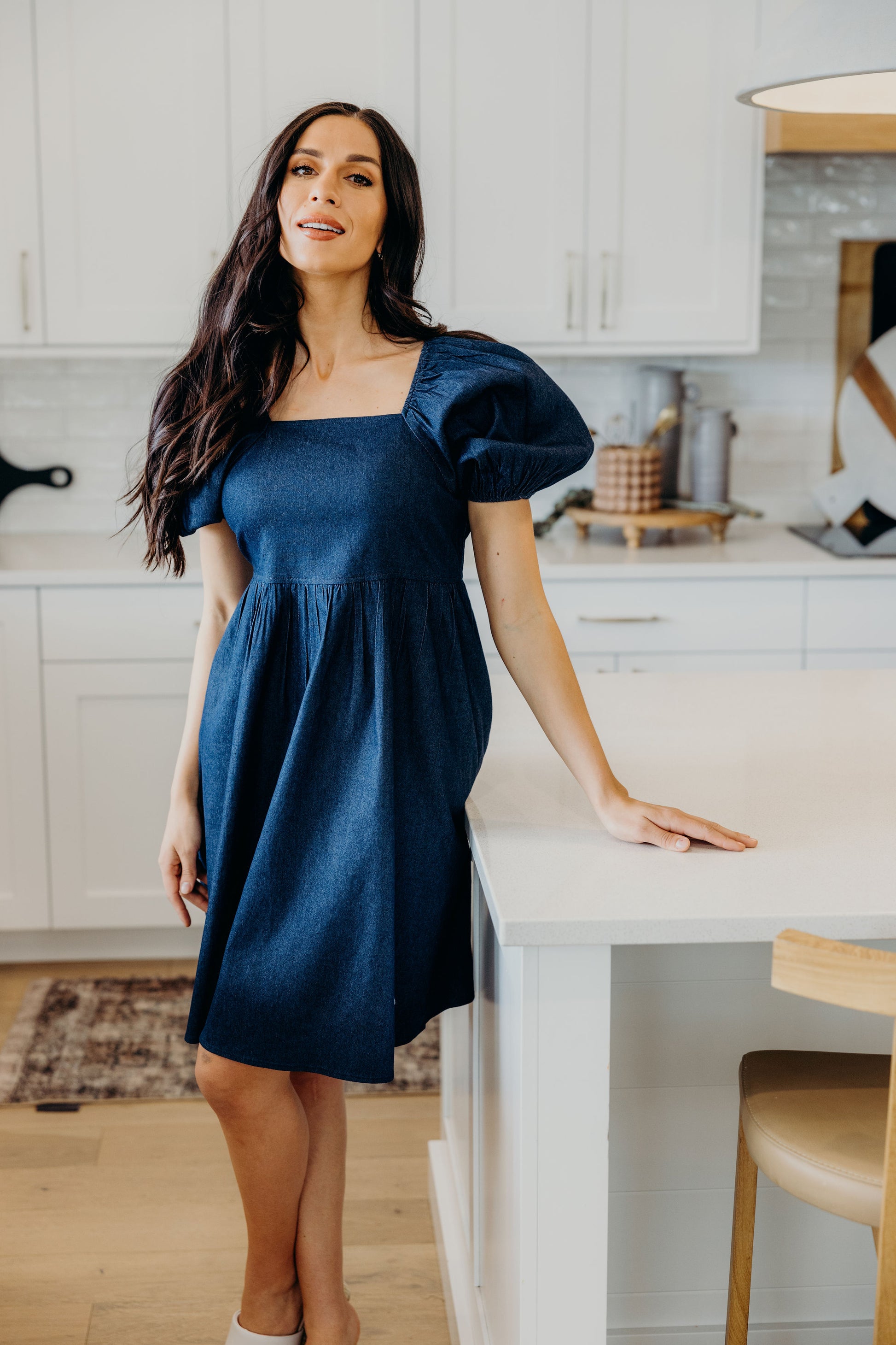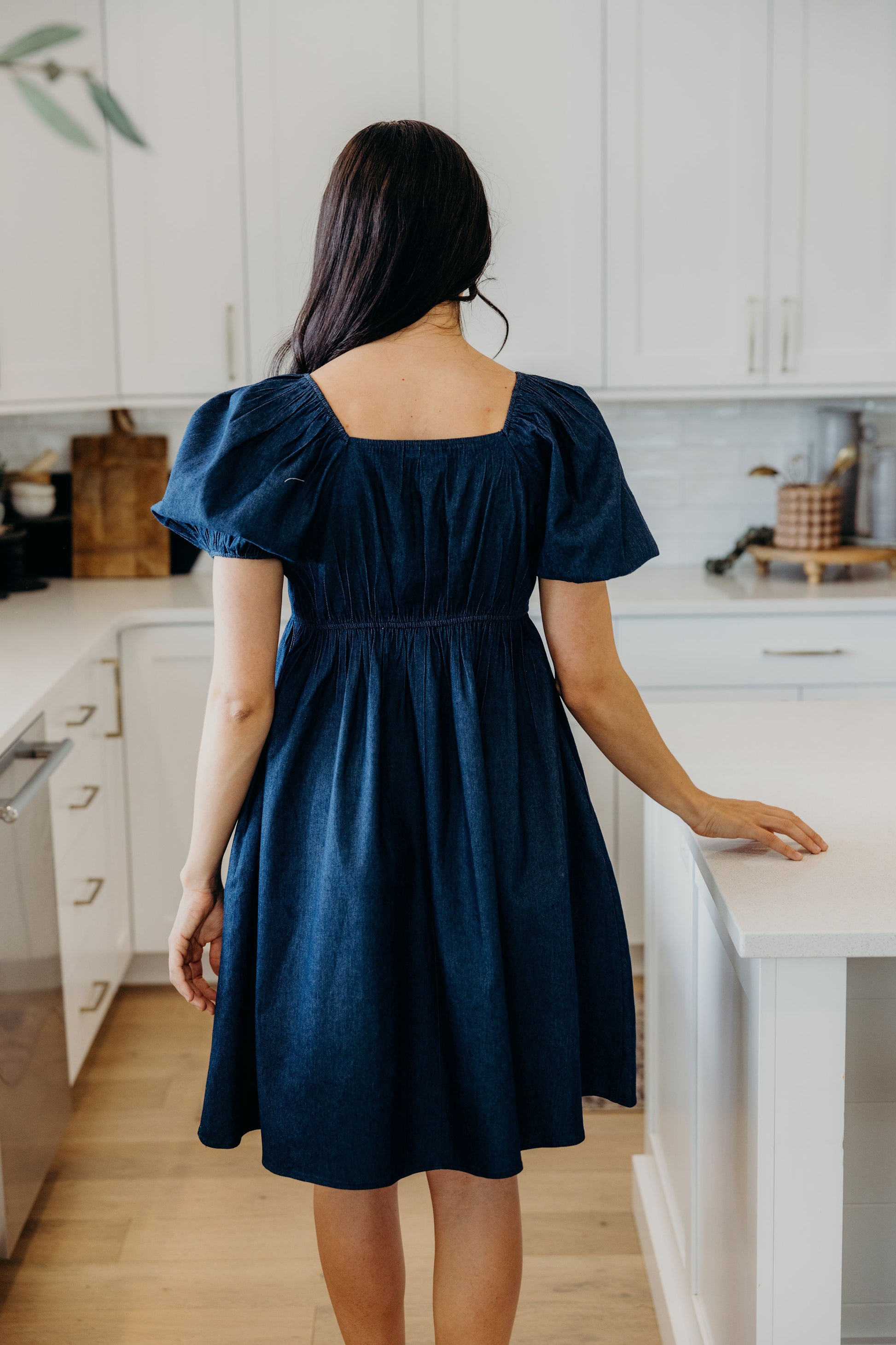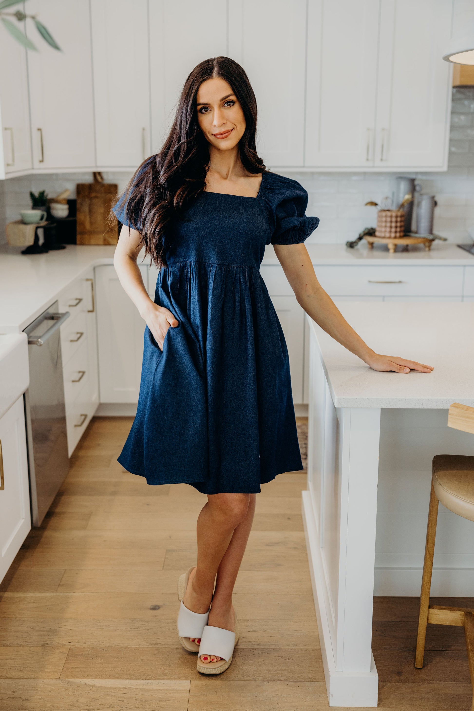 Knee length dress with empire waist, square neckline, puff sleeves, and pockets.