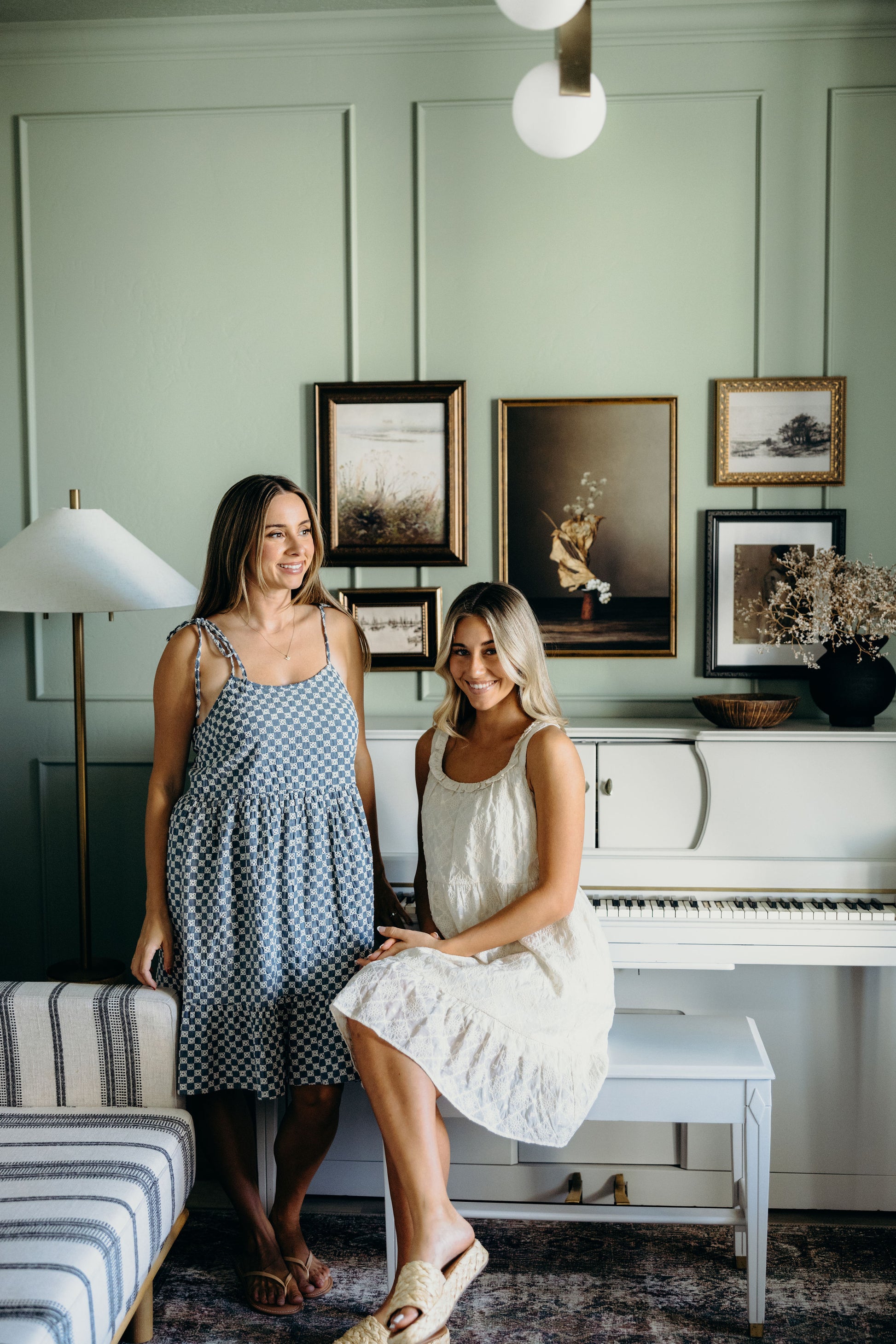 Knee length overall dress with tiered skirt, square neckline with ruffle detail.