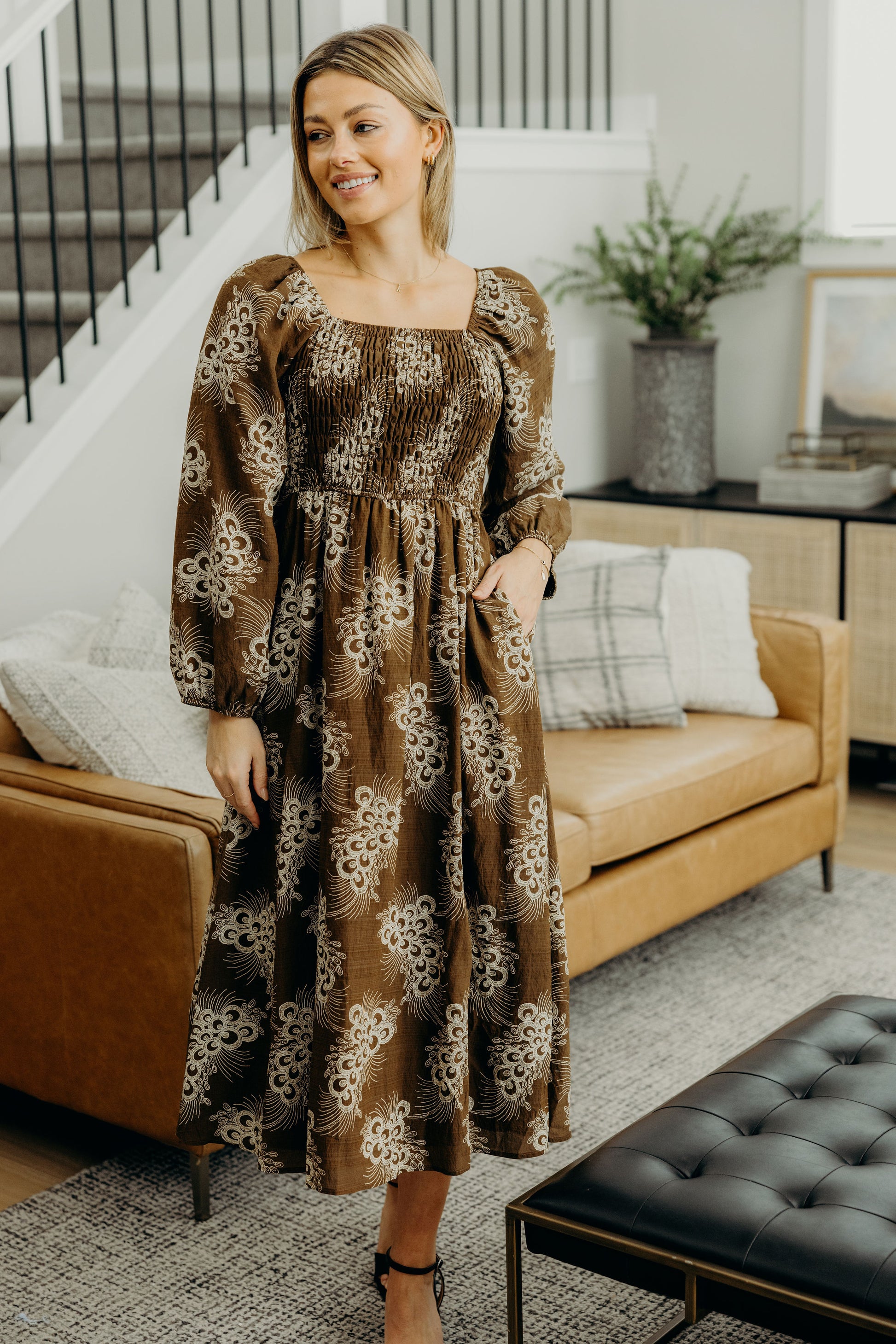 Mid-length dress with square neckline, smocked bodice, and long sleeves.