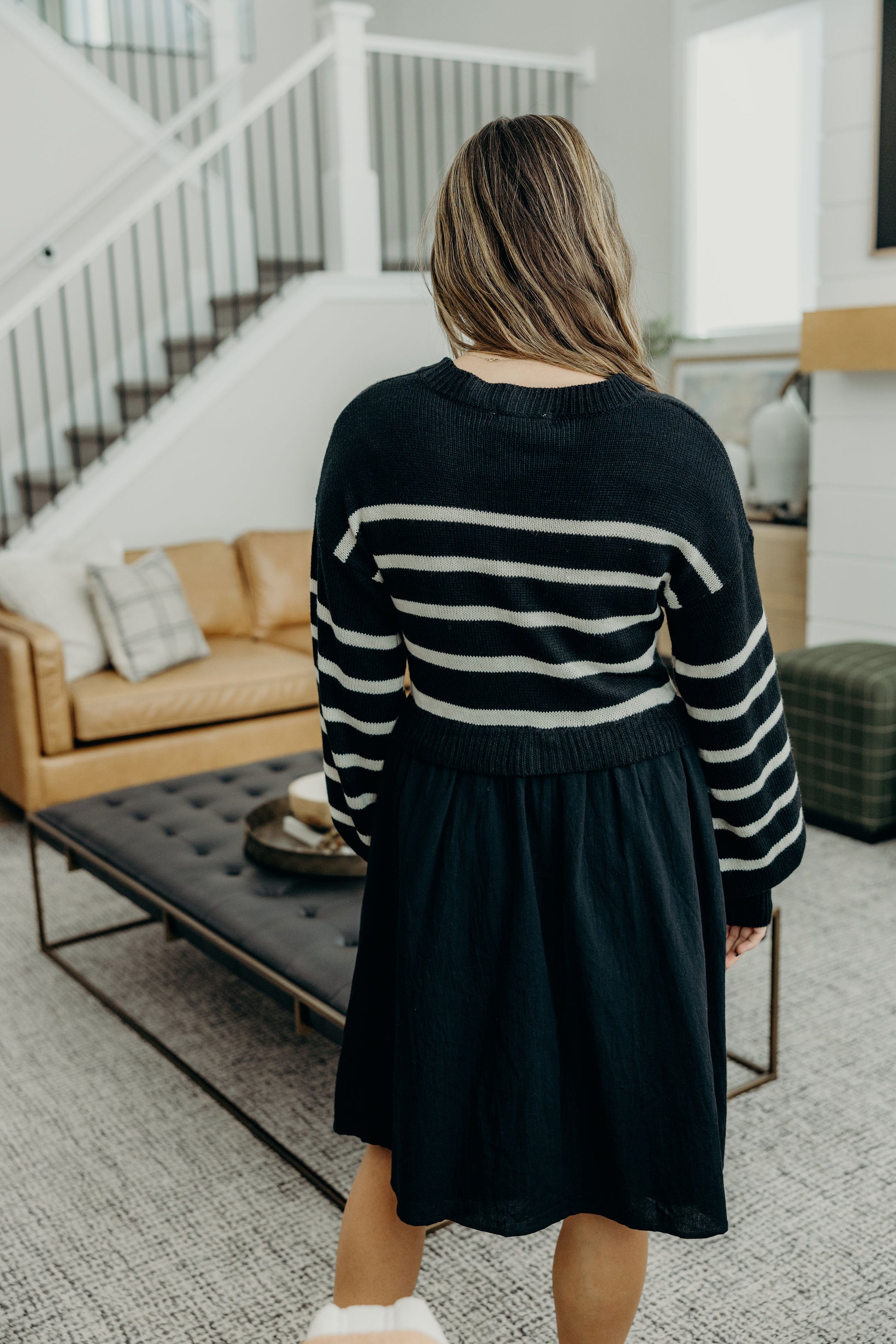 Knee length dress with fit and flare silhouette, sweater top with long sleeves, round neckline, and pockets.