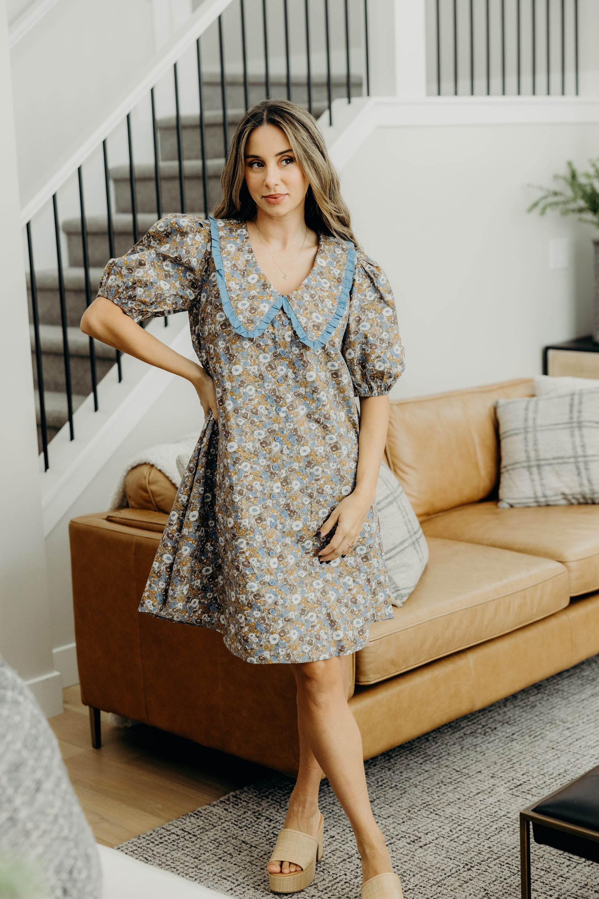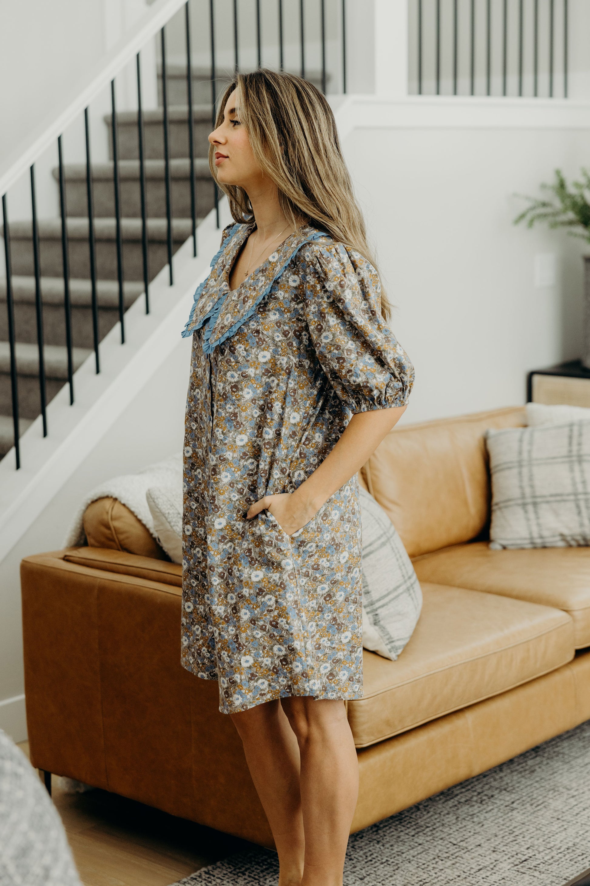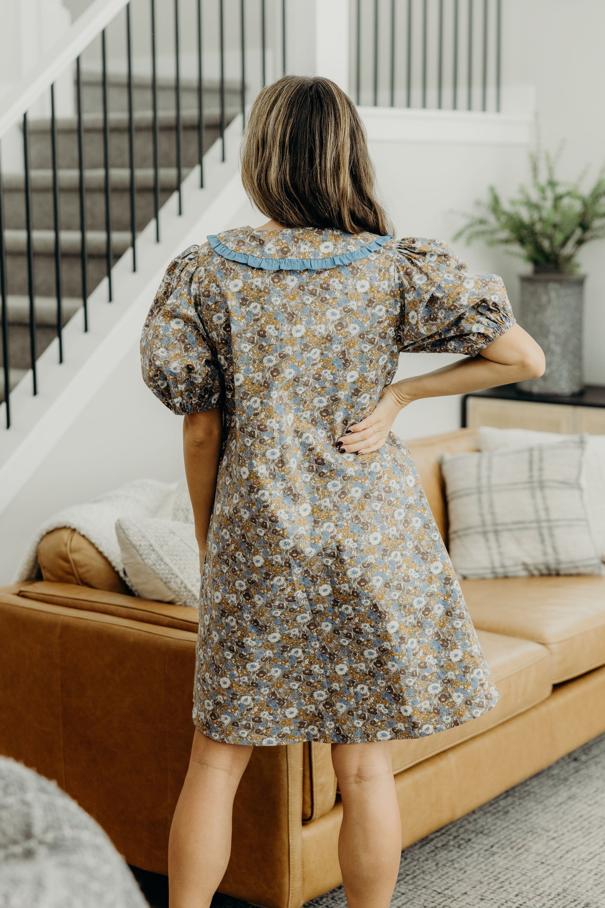 Short dress with peter pan collar and button detail with puff sleeves and pockets.