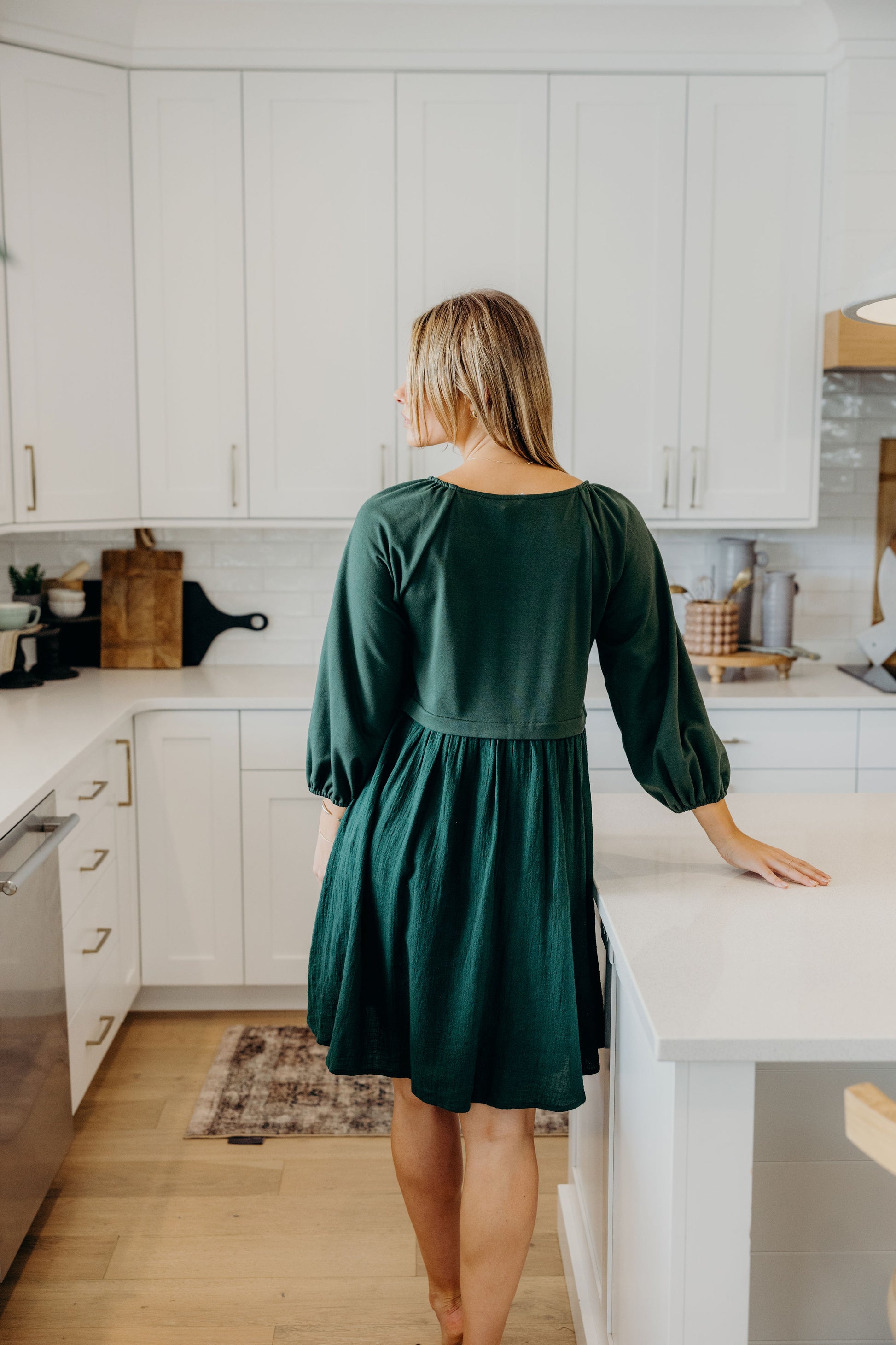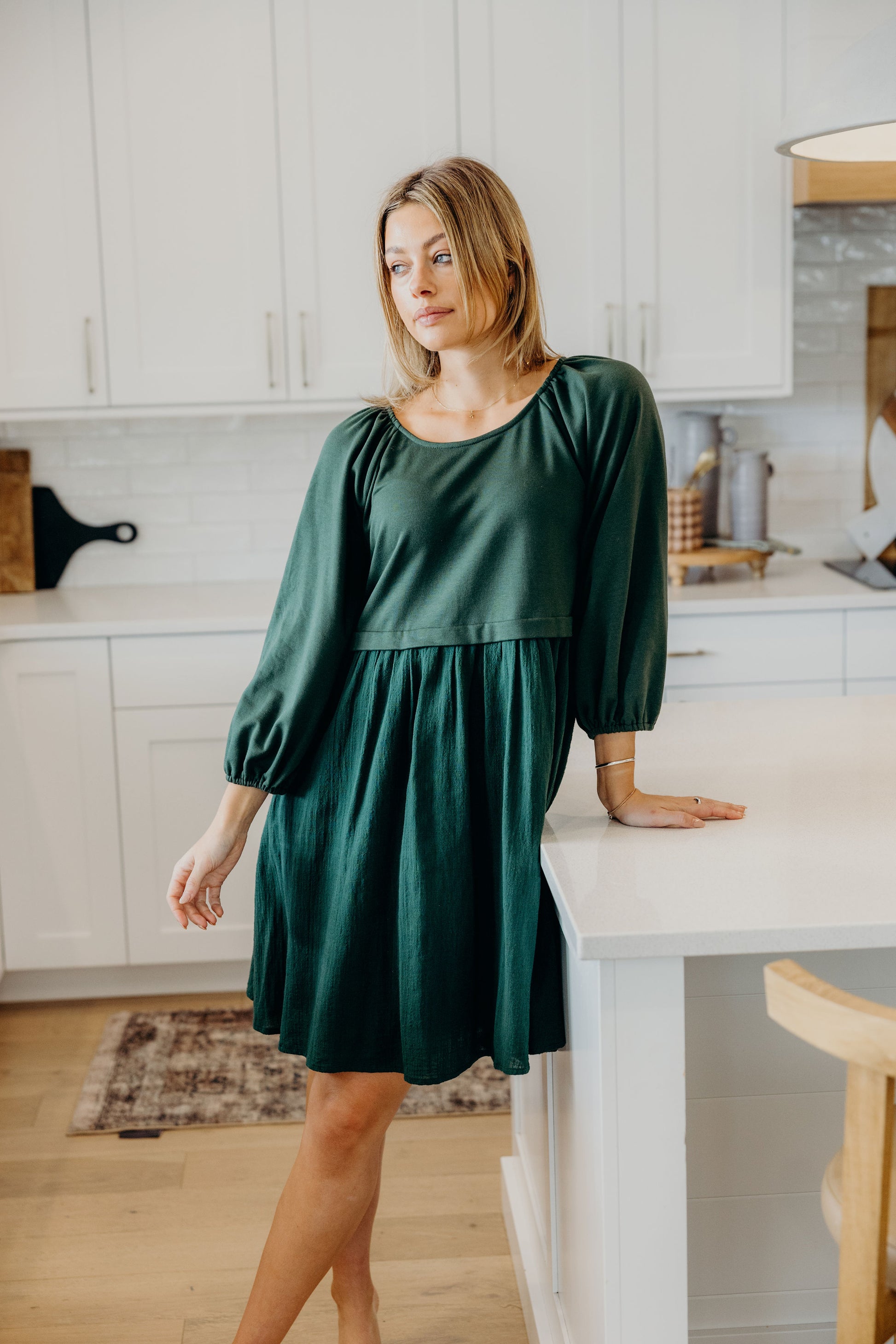 Knee-length dress with ¾ sleeve with elastic cuffs, with relaxed fit empire waist.