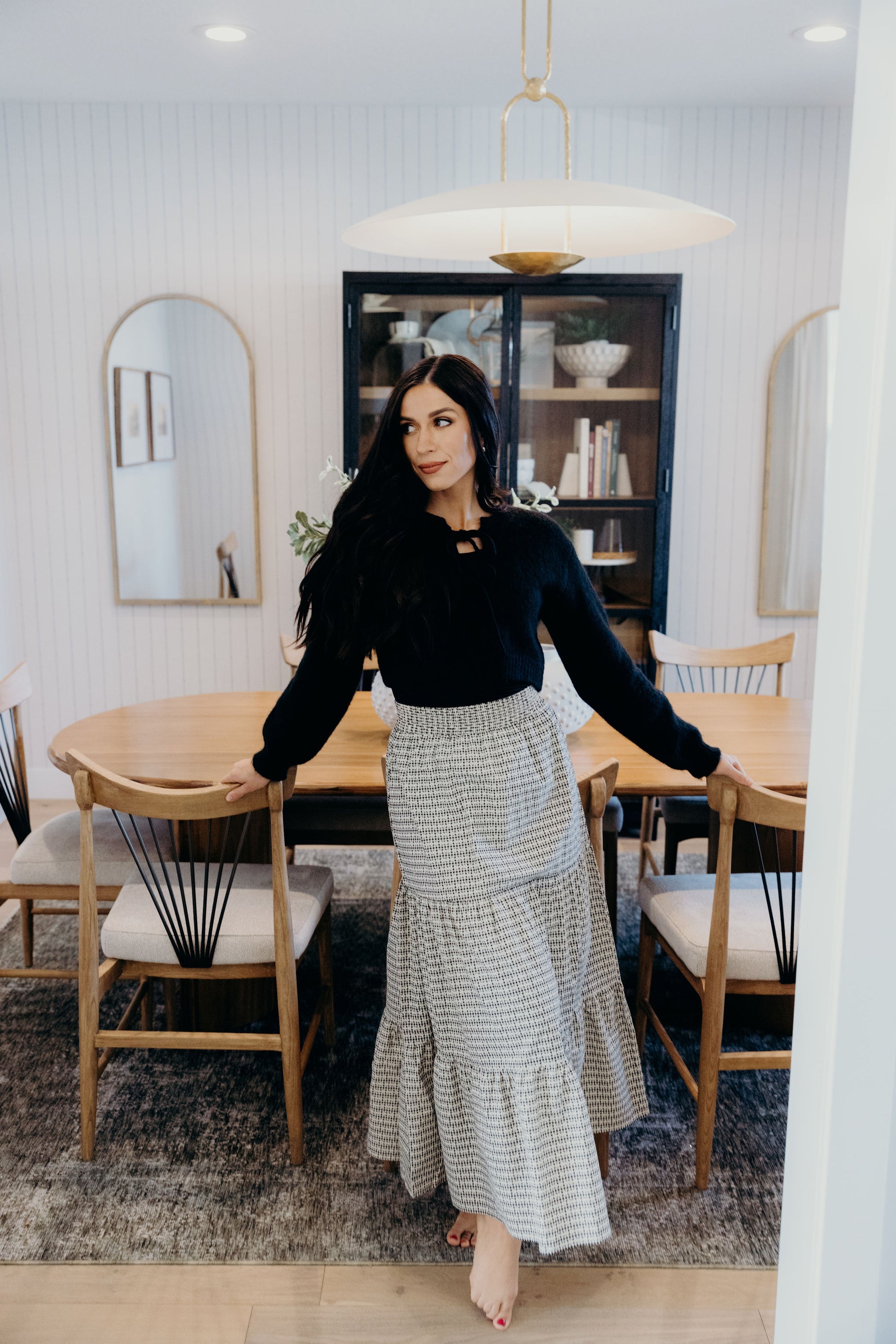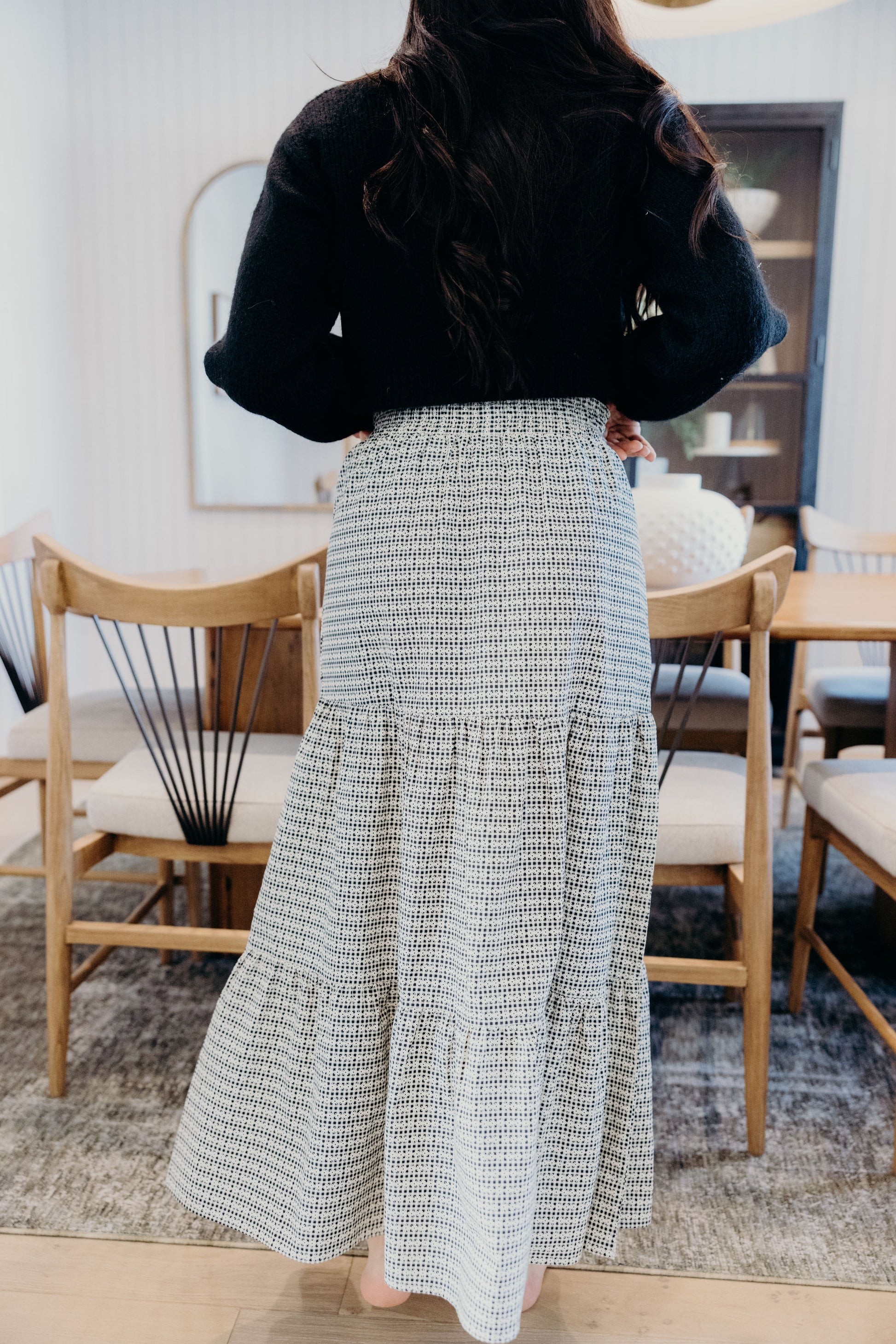 Maxi length skirt with tiered detail and elastic waist.