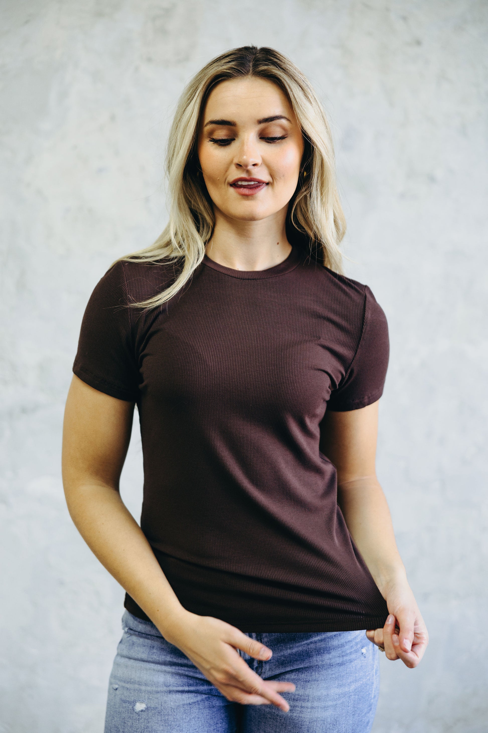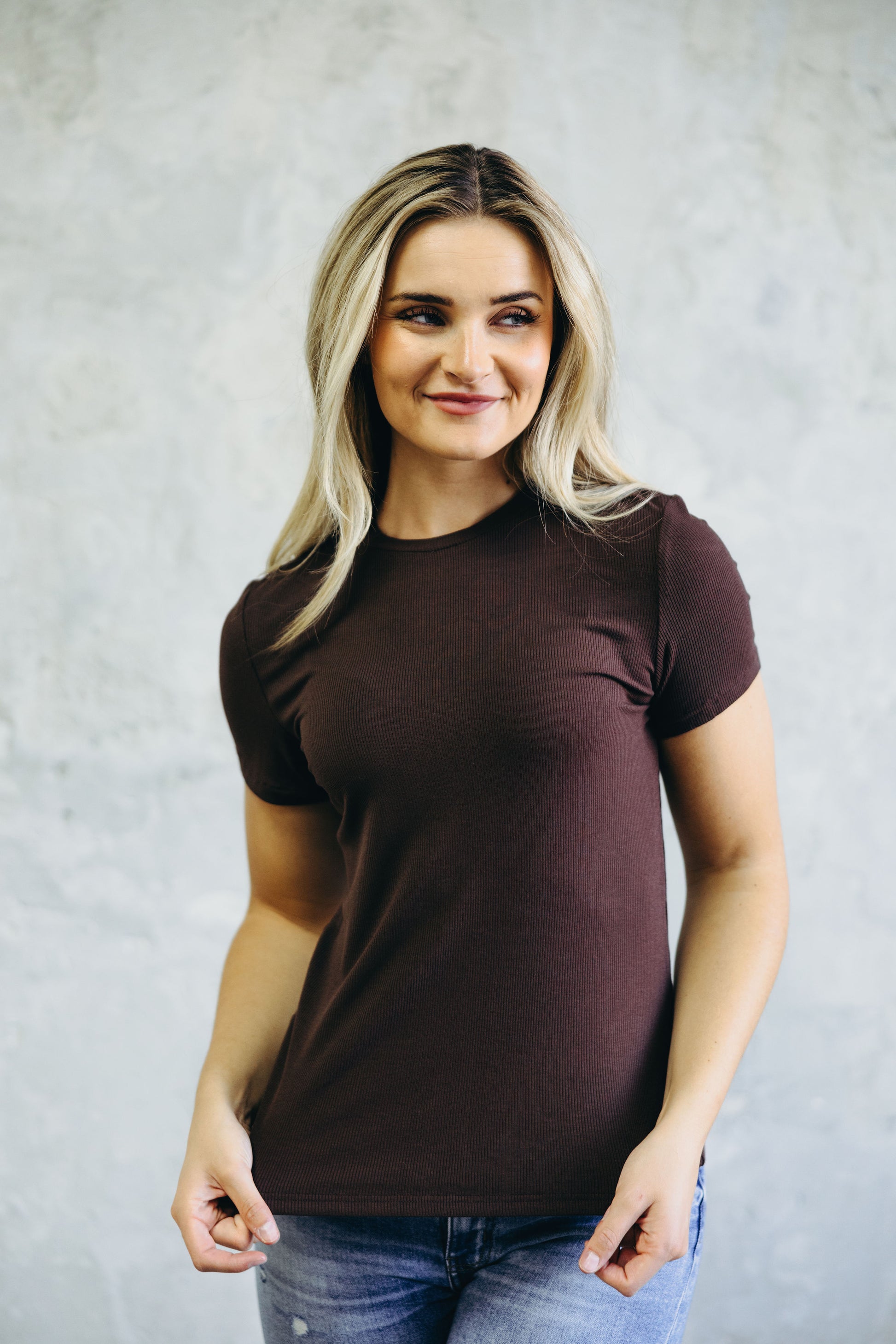 Short sleeve ribbed tee with crew neckline.