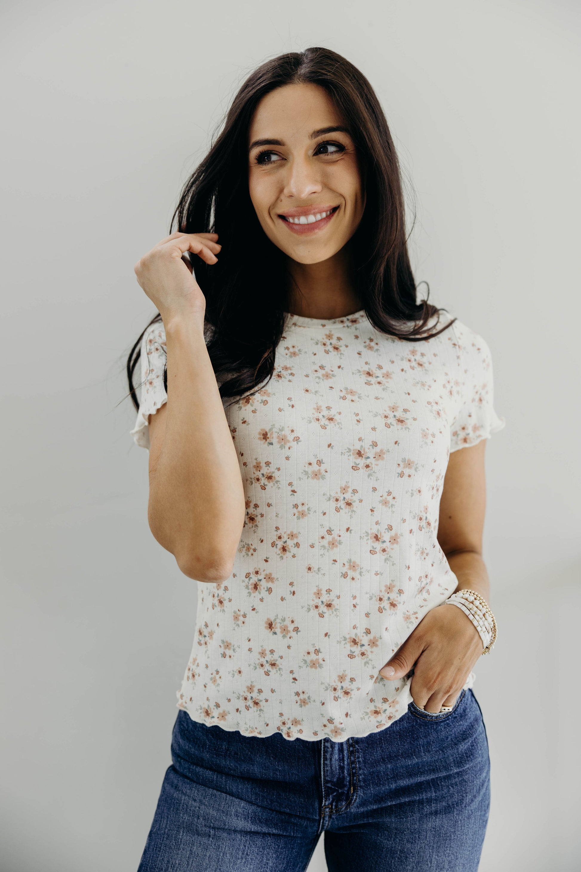 Short sleeve tee with crew neckline and lettuce hem detail.